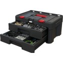 Skrzynka z 2 szufladami Stack’N’Roll to bardzo praktyczne rozwiązanie do przechowywania różnego rodzaju śrubek, gwoździ, wkrętów czy innych drobnych akcesoriów narzędziowych, a także wszelkiego rodzaju przyborów hobbystycznych. Została zaprojektowana z myślą o wszystkich, którzy cenią sobie najwyższą jakość i funkcjonalność. Pełne wysunięcie szuflad zapewnia maksymalny dostęp do zawartości, a specjalna listwa blokująca zabezpiecza przed przypadkowym wysunięciem podczas transportu. Szuflady wyposażone są w wyjmowane przegrody, które pozwalają dostosować ich przestrzeń do przedmiotów o różnych rozmiarach. Dodatkowo skrzynka posiada górną rączkę z miękkim gumowym uchwytem oraz uchwyty boczne dla wygodnego przenoszenia. Dzięki innowacyjnemu systemowi spinania jest w pełni kompatybilna z pozostałymi modułami występującymi w serii Stack’N’Roll.