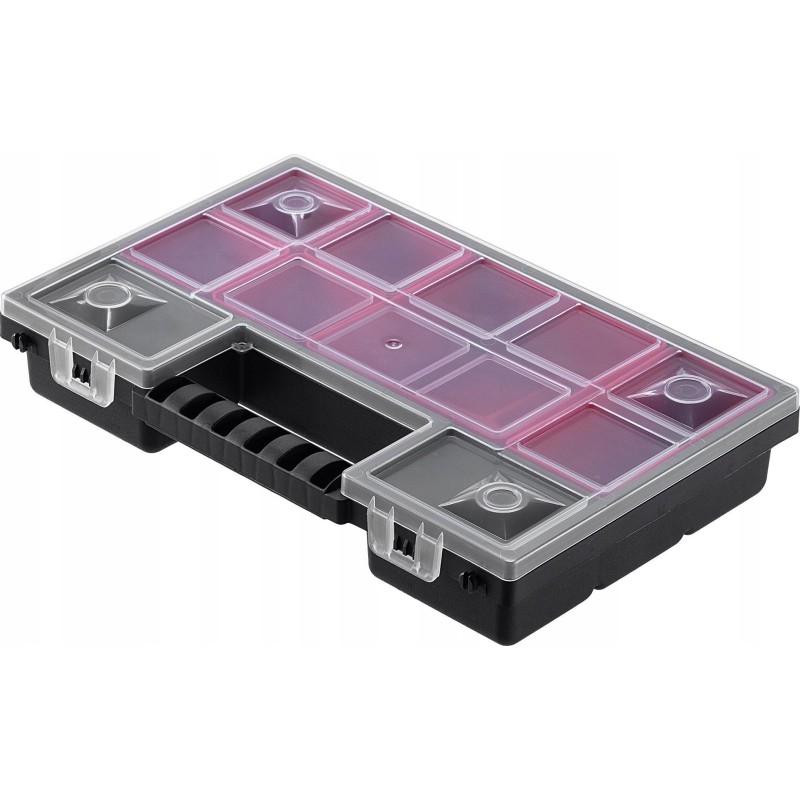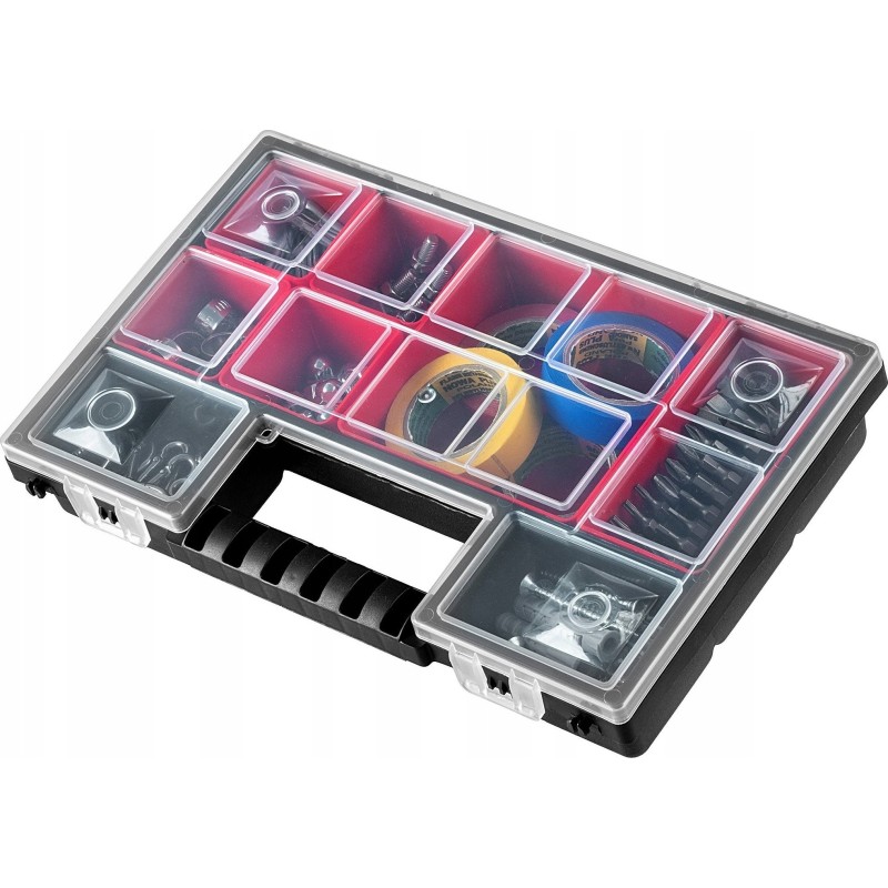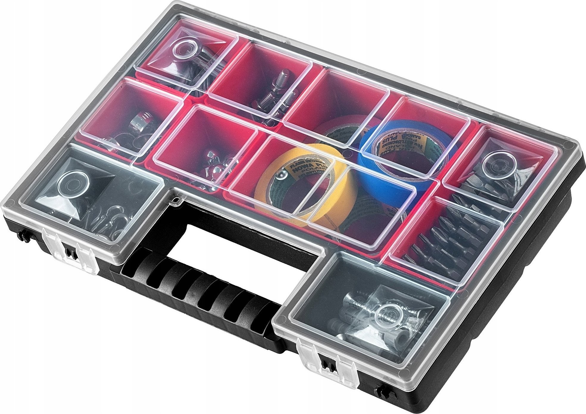 WYTRZYMAŁY – korpus i przezroczystą pokrywę wykonano z solidnego tworzywa sztucznego. Organizer na narzędzia posiada wytrzymałe zapięcia, które zabezpieczają pokrywę i skutecznie chronią przed nieoczekiwanym wysypaniem zawartości.