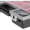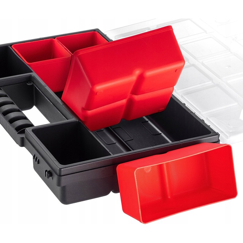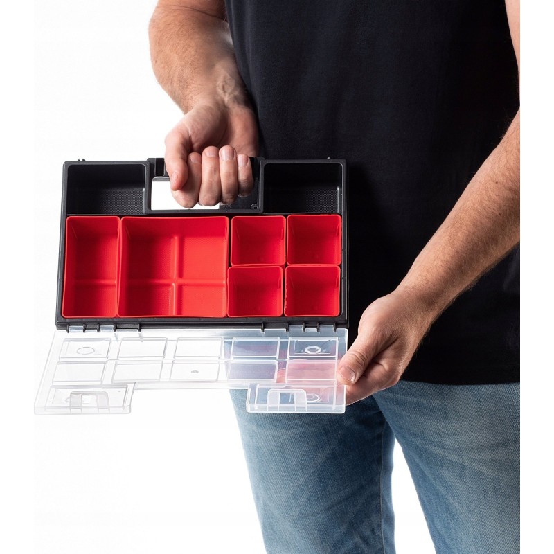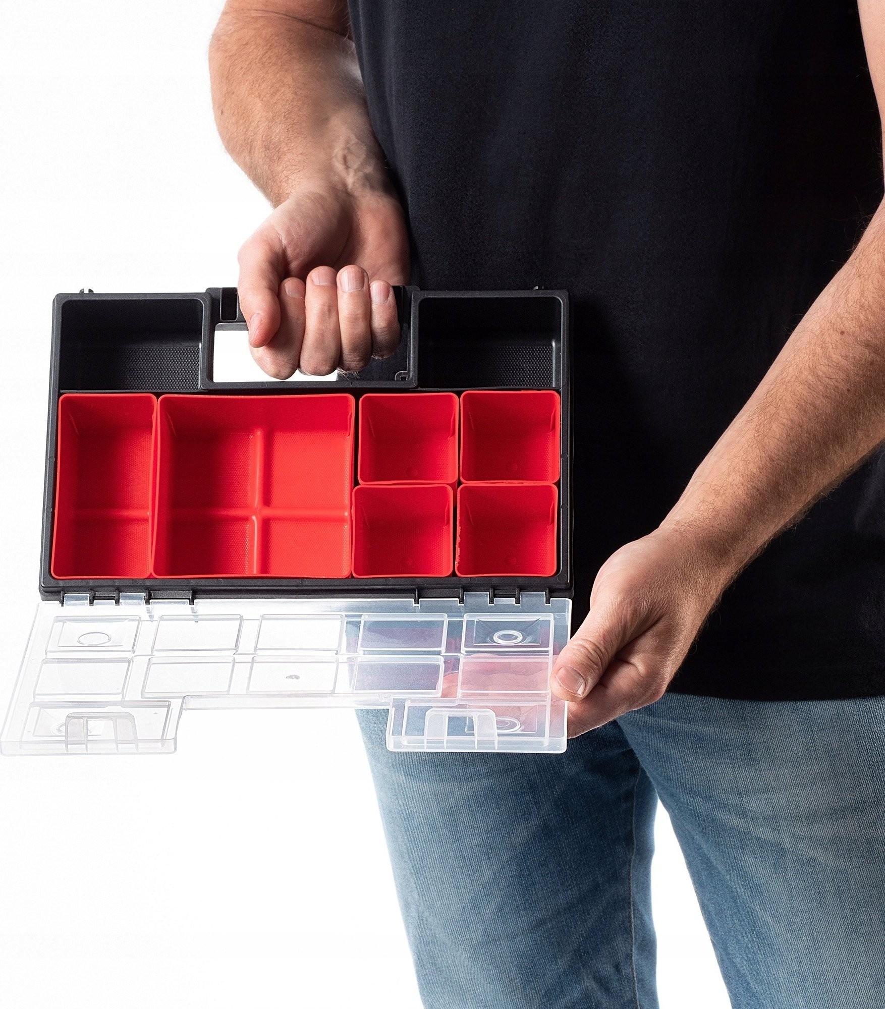 WYGODNY – organizer narzędziowy posiada wygodny uchwyt, dzięki któremu łatwo przenieść go w dowolne miejsce. Natomiast transparentna pokrywa umożliwia szybkie sprawdzenie zawartości i odszukanie potrzebnych akcesoriów.