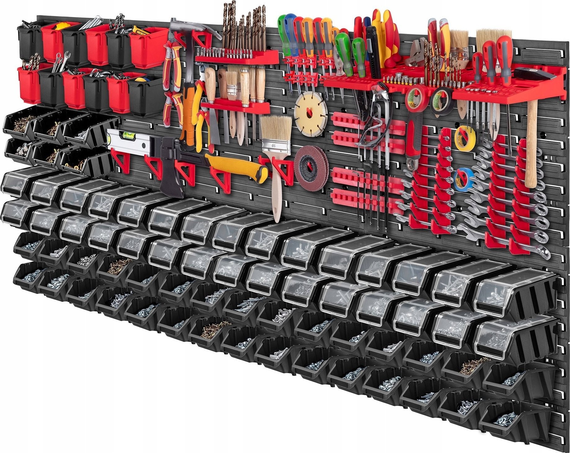 FUNKCJONALNE - kuwety warsztatowe pomieszczą naprawdę sporo elementów drobnicowych i niewielkich narzędzi. Natomiast na uchwytach i półkach powiesisz śrubokręty, klucze, młotki i wiele innych akcesoriów, które chcesz mieć pod ręką.