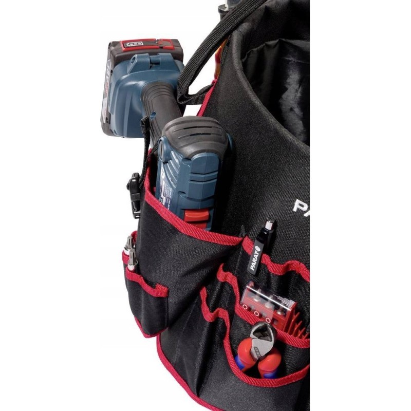 Dodatkowo, torba na narzędzia PARAT Basic Tool Bucket zawiera kieszeń na wkrętarkę akumulatorową, uchwyt i pasek na ramię, umożliwiające wygodne przenoszenie torby. Zestaw nie zawiera narzędzi.