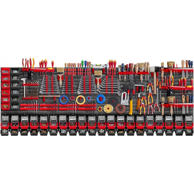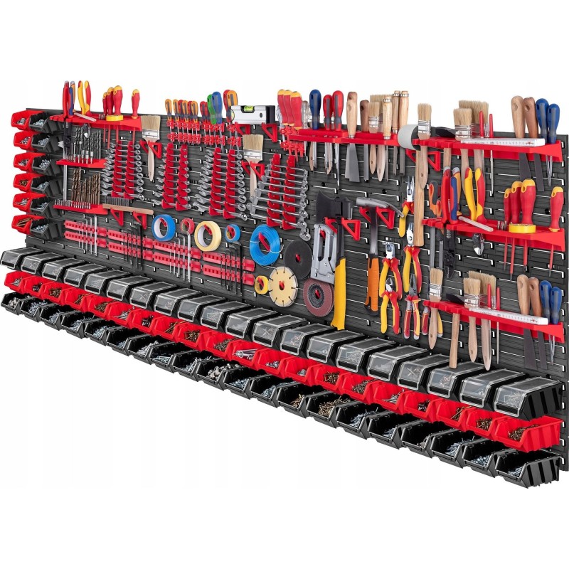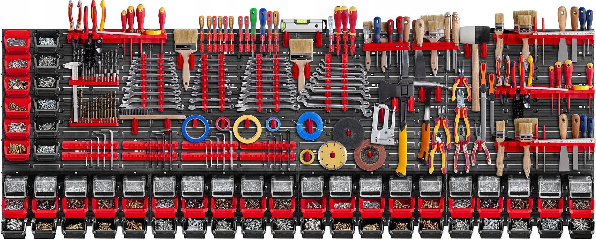 FUNKCJONALNE - kuwety warsztatowe pomieszczą naprawdę sporo elementów drobnicowych i niewielkich narzędzi. Natomiast na uchwytach i półkach powiesisz śrubokręty, klucze, młotki i wiele innych akcesoriów, które chcesz mieć pod ręką.