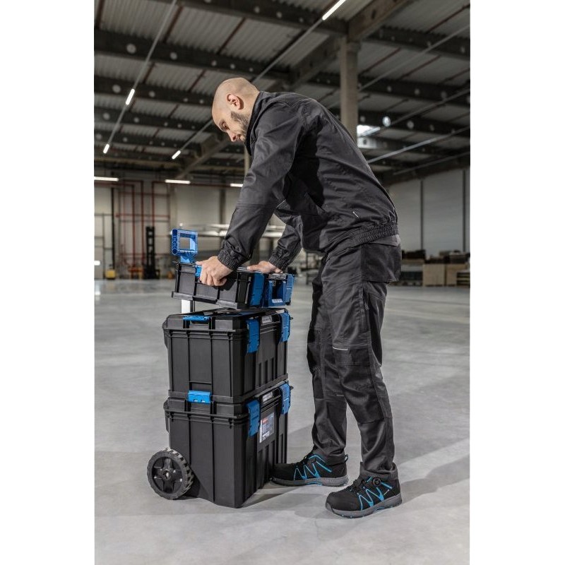Składany zestaw skrzyń 4 w 1 to rozwiązanie stworzone z myślą o wymagających użytkownikach. W skład zestawu wchodzą skrzynie: HT7G501, HT7G502 I HT7G503. Skrzynie wykonane są z wysokiej jakości materiałów, które gwarantują ich wytrzymałość i odporność na uszkodzenia. Dodatkowo, skrzynie są pyłoszczelne i odporne na działanie wody. Wytrzymała konstrukcja ścian wzmocniona zapięciami z ABS zapewniają długotrwałe użytkowanie bez ryzyka uszkodzeń. Zestaw skrzyń jest wyposażony w funkcjonalne nosidło wewnętrzne oraz duże koła pokryte gumą, co ułatwia transport. Doskonale sprawdza się w przechowywaniu i transporcie różnych przedmiotów. Zalecany zarówno do użytku profesjonalnego, jak i domowego. Idealny wybór dla branż takich jak budownictwo, przemysł, motoryzacja czy logistyka.