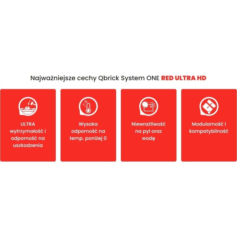 Bryła szafki wykonana jest według sprawdzonego schematu Qbrick ONE 2.0, z wieloma żebrowanymi wzorami i super wytrzymałą pokrywą, która umożliwia swobodne użytkowanie. W wersji CZERWONEJ użyto ultrawytrzymałego tworzywa, odporne na trudne warunki budowlane. Sama szuflada, choć nie jest czerwona, wykonana jest z tworzywa ABS - tworzywa technicznego o dużej wytrzymałości i twardości, co istotnie wpływa na dno szuflady, które nie ulega deformacji pod obciążeniem. Tworzywo CZERWONE i ABS jest połączone trwałymi, trzyczęściowymi szynami. Ich konstrukcja zapewnia odpowiednie wsparcie dla w pełni wysuniętej komory, gwarantując solidność na najwyższym światowym poziomie.