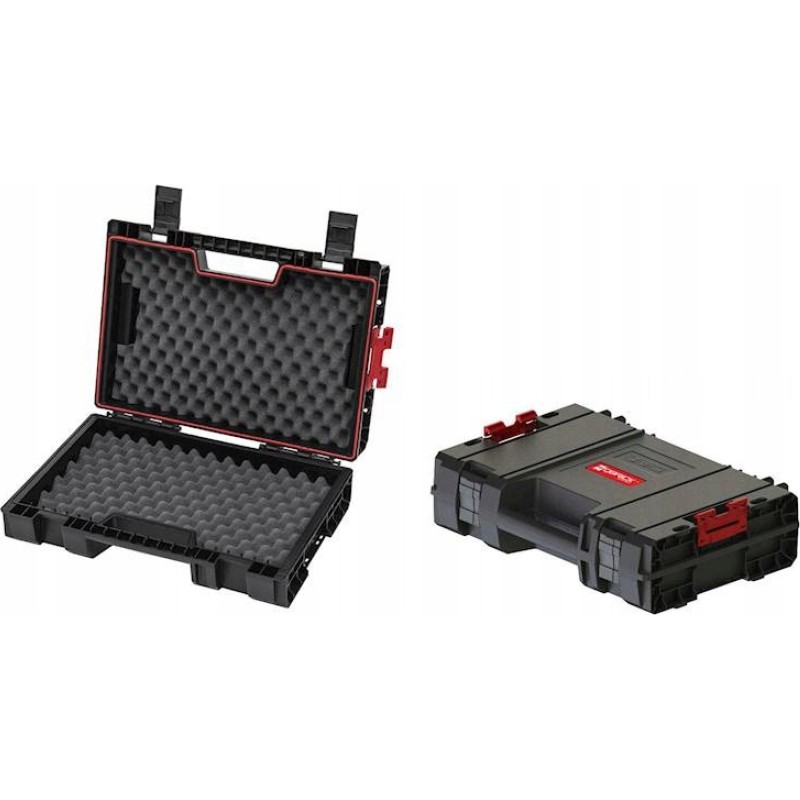 Pojemnik na narzędzia PRO Tool case Qbrick SKRQTCPROFCZAPG001 to walizka zaprojektowana do bezpiecznego przechowywania i wygodnego przenoszenia pojedynczych elektronarzędzi lub laserowych sprzętów pomiarowych. Kompaktowa konstrukcja o dłuższym boku o wymiarach skrzyni PRO500 pozwala na umieszczenie wewnątrz jednego konkretnego narzędzia takiego jak wiertarko-wkrętarka z akumulatorami, mała szlifierka kątowa, wiertarka lub młotowiertarka SDS Plus lub również laser krzyżowy, dalmierz i inne. Wewnętrzne ścianki walizki są pokryte uniwersalną pianką, która trzyma zawartość na miejscu, zapewniając bezpieczny transport bez obijania się narzędzi o ścianki lub inne przechowywane elementy. Dwie poliamidowe klamry umożliwiają solidne i łatwe zapięcie walizki, a opatentowana konstrukcja bocznych łączników pozwala na połączenie Tool Case z kolejną walizką lub skrzynką PRO500. Walizka może być przenoszona za rączkę lub mocowana do pokrywy kufra Qbrick System ONE Cart i w przyszłości do innych modeli PRO. Skrzynka na narzędzie elektryczne Tool Case PRO Protective Foam jest doskonałym uzupełnieniem uniwersalnych walizek systemowych Qbrick.