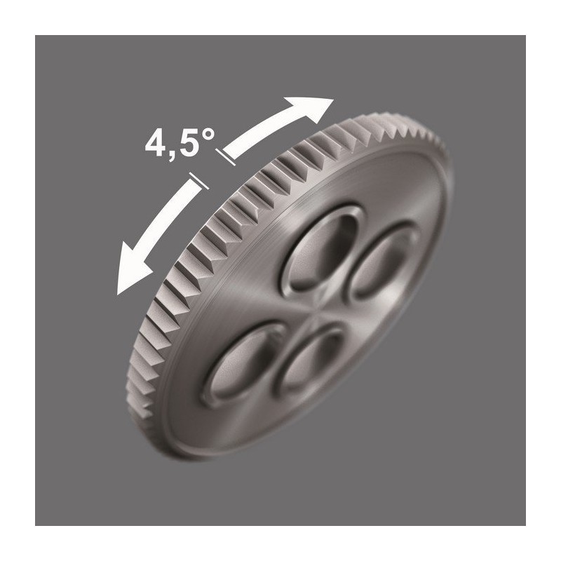 Drobnozębny mechanizm zapadkowy w rękojeści (80 zębów/kąt powrotu zapadki 4,5deg;) umożliwia łatwiejsze i szybsze wkręcanie bez konieczności ponownego nasadzania narzędzia.