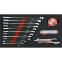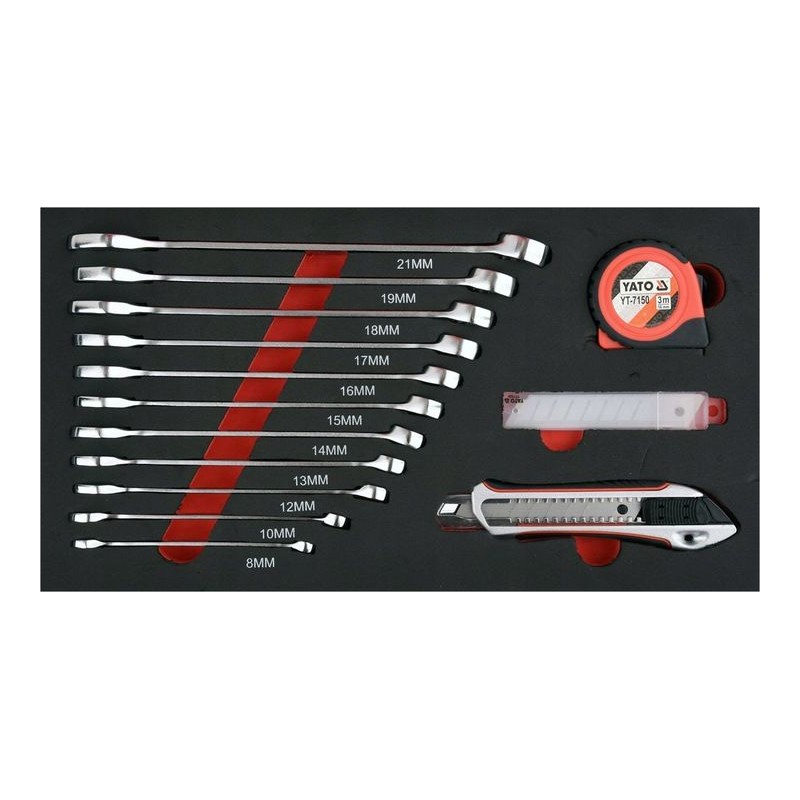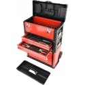 Górny moduł to klasyczna skrzynka narzędziowa o wymiarach 420x220x150 mm i nośności 20 kg. Posiada wbudowane 2 wysuwane organizery oraz tackę narzędziową. Dodatkowo wewnątrz skrzynki znajduje się wkładka z narzędziami: