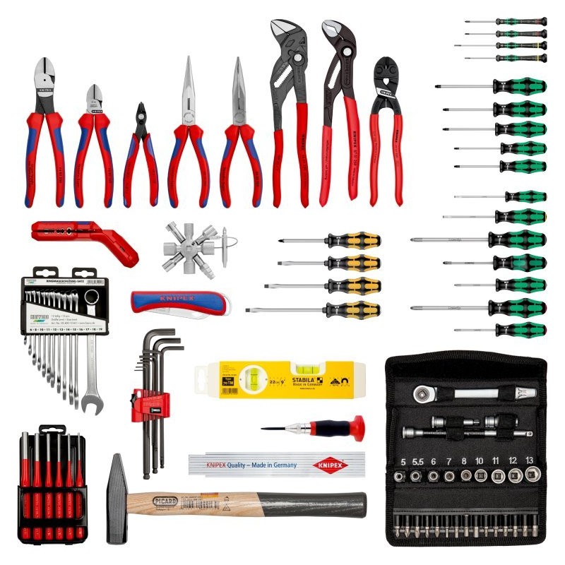 - 1 x punktak, 1 x szczypce do cięcia bocznego, 1 x Knipex CoBolt kompaktowe szczypce tnące (Ø 5,2 mm), 1x Obcęgi boczne, 1x Szczypce tnące do elektroniki Super Knips XL, 1x Szczypce i klucz w jednym narzędziu, 1 x szczypce do pomp wodnych KNIPEX Cobra, 1 x zestaw wybijaków Rennsteig (Ø 3 mm / 4 mm / 5 mm / 6 mm / 8 mm / 10 mm) , 1 x Drewniana miarka składana Stabila typ 1607 biała, 2 m., 1 x poziomica Stabila Typ 70TM (22 cm), 1 x miarka składana Knipex Stabila 400 (200 mm), 1 x młotek (300 g), 1 x zestaw kluczy Wera (1,5 - 10 mm), 1 x Zestaw nasadek Wera Zyklop Metal 8100 SA 8 28 sztuk (1/4), 1 x wkrętak płaski Wera 335 (0,6 x 3,5 x 100 mm), 1 x wkrętak krzyżakowy Wera 350PH (PH1 x 80 mm), 1 x wkrętak krzyżakowy Wera 350PH (PH3 x 150 mm), 1 x wkrętak krzyżakowy Wera 355PZ (PZ1 x 80 mm), 1 x wkrętak do wkrętów z rowkiem krzyżowym Wera 355PZ (PZ2 x 100 mm), 1 x wkrętak do wkrętów z rowkiem krzyżowym Wera 355PZ (PZ3 x 150 mm), 1 x wkrętak do wkrętów z rowkiem krzyżowym Wera 355PZ (PZ3 x 150 mm), 1 x wkrętak Wera do wkrętów z rowkiem 2035 (0,4 x 2,5 x 80 mm), 1 x wkrętak krzyżakowy Wera 917 SPH (PH2 x 100 mm), 1 x wkrętak Wera Micro PH00 (PH00 x 60 mm), 1 x wkrętak płaski Wera 932A (5,5 x 100 mm), 1 x śrubokręt płaski do podbijania Wera 932 A (1,2 x 7,0 x 125), 1 x śrubokręt płaski do podbijania Wera 932 a (1,6 x 9,0 x 150), 1 x wkrętak Wera TX 10x80 367, 1 x wkrętak Wera TX 15x80 367, 1 x wkrętak Wera TX 20x100 367, 1 x wkrętak Wera TX 25x100 367, 1 x wkrętak Wera TX 30x115 367