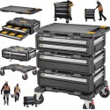 System wieżowy składa się z pięciu modułów, które można dostosować do różnych potrzeb. W zestawie znajdują się dwa organizery z jedną głęboką szufladą oraz jeden organizer z dwiema płytkimi szufladami, co umożliwia przechowywanie narzędzi o różnej wielkości. Blat roboczy oferuje przestrzeń do pracy, a platforma transportowa na kółkach ułatwia przemieszczanie całego zestawu.