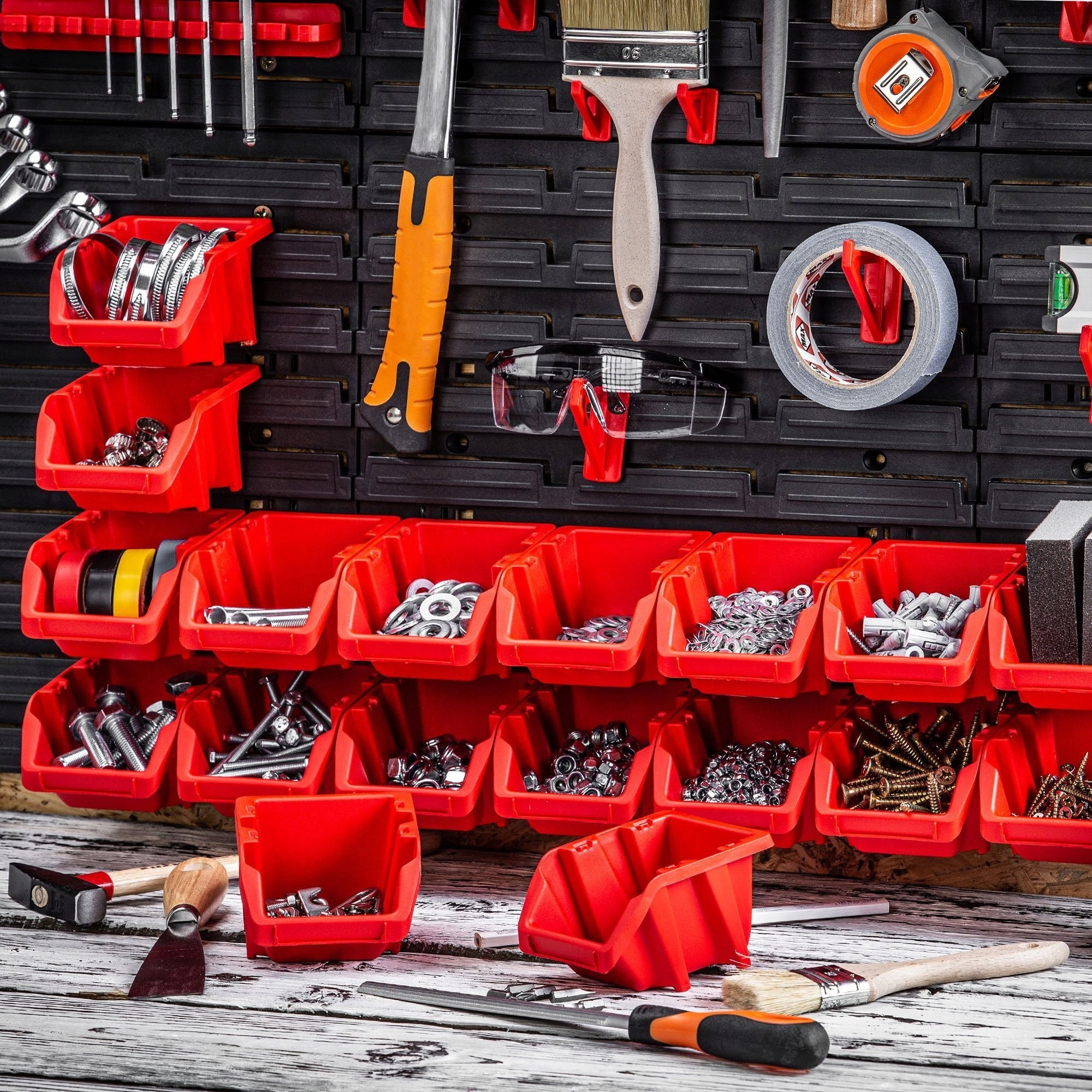 ŁATWE DO PRZECHOWYWANIA – pojemniki magazynowe można zamontować na tablicy warsztatowej, aby lepiej zorganizować przestrzeń w miejscu pracy. Jeśli chcesz postawić je na blacie roboczym, możesz piętrować kuwety, aby zajmowały mniej miejsca.
