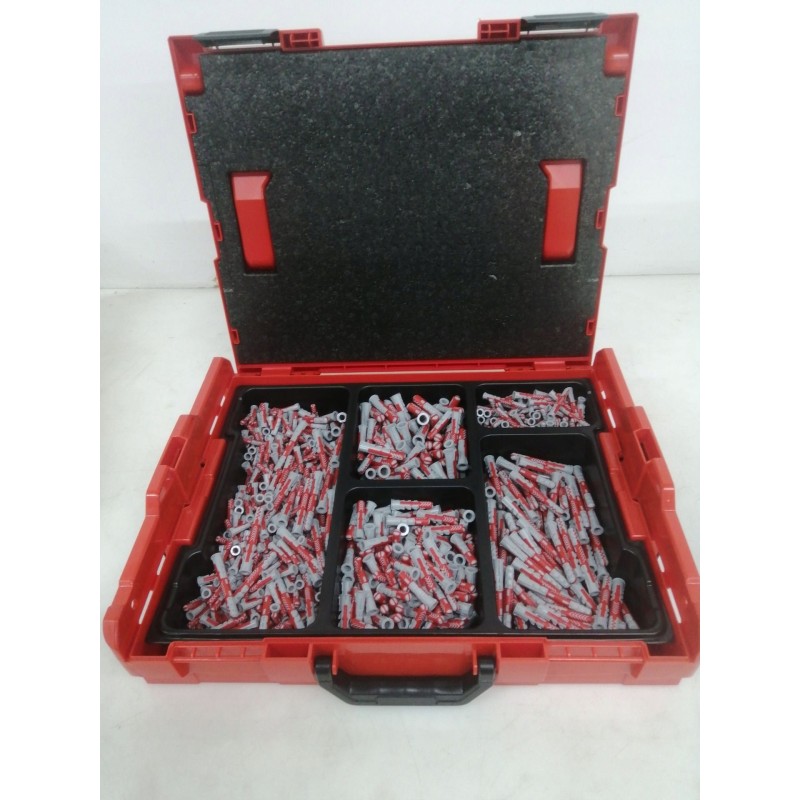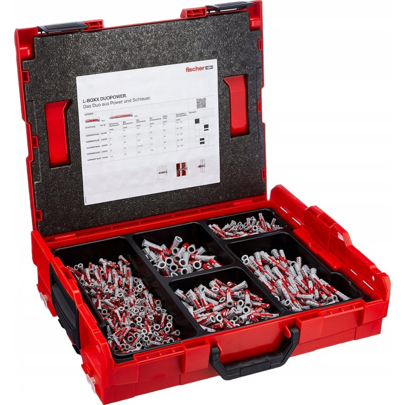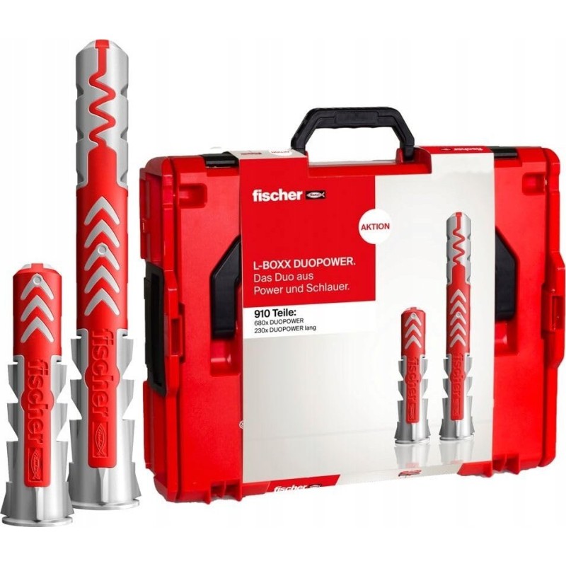 - Nazwa typu produktu: Fischer L-BOXX 102 DUOPOWER - uniwersalne kołki, efektywny kołek dwuskładnikowy, wykonany z tworzywa sztucznego, do mocowania w betonie, cegle, kamieniu, płytach gipsowo-kartonowych i wielu innych. Bez używania śrub. Paczka zawiera 910 x DUOPOWER w różnych rozmiarach.