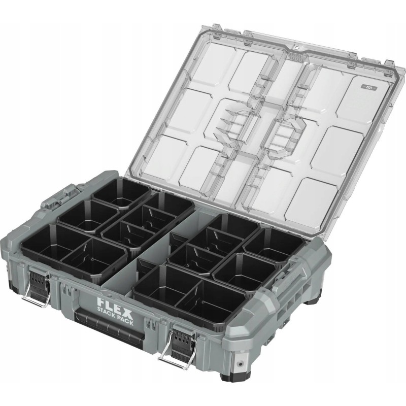 W dużym organizerze z przezroczystą pokrywą można przechowywać małe części, takie jak pudełka na końcówki, śruby itp.