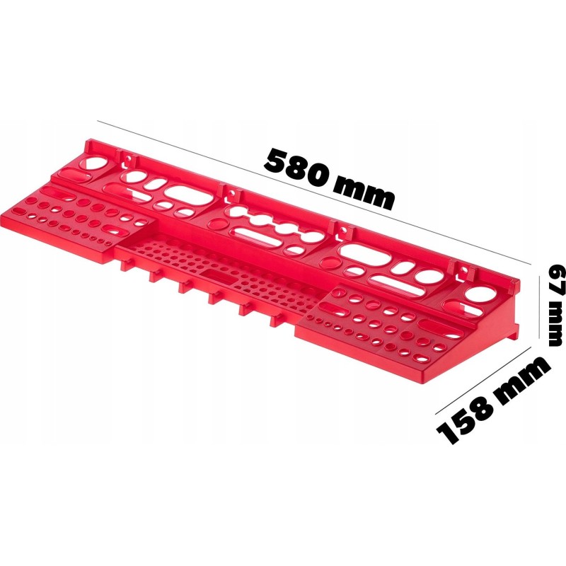 MODUŁOWA BUDOWA – duża tablica narzędziowa ma modułową budowę. Składa się z wielu elementów, które możesz dowolnie konfigurować i rozbudować o kolejne moduły. Uniwersalny rant umożliwia powieszenie zarówno kuwet warsztatowych, półek, jak i wieszaków narzędziowych.