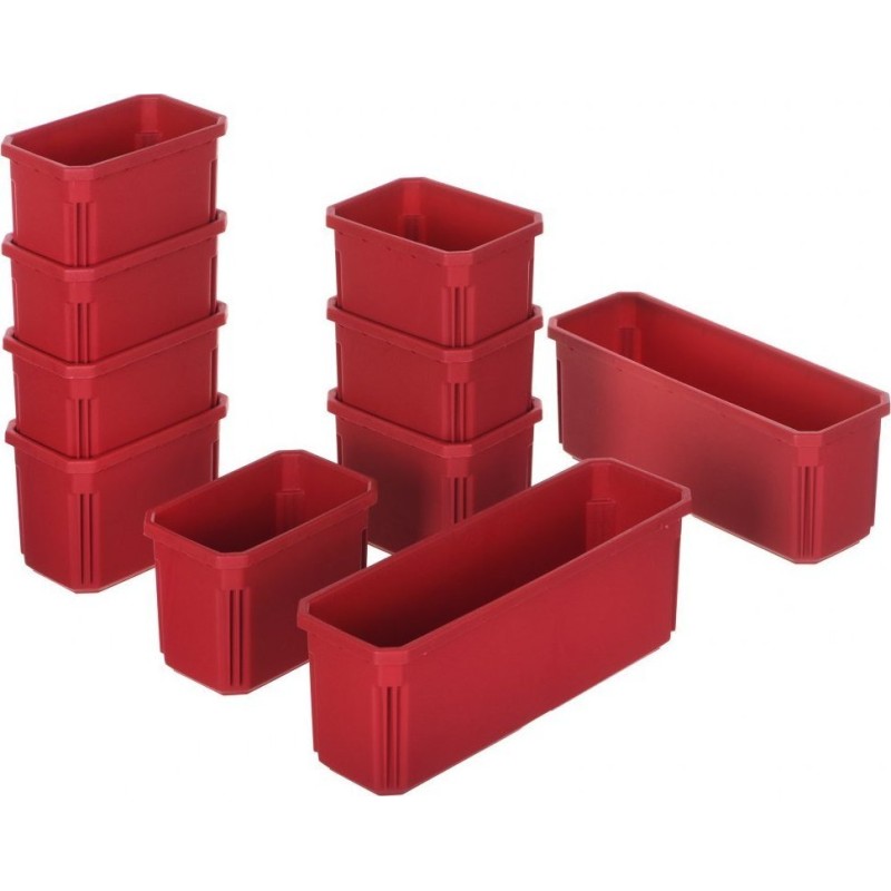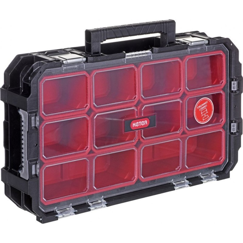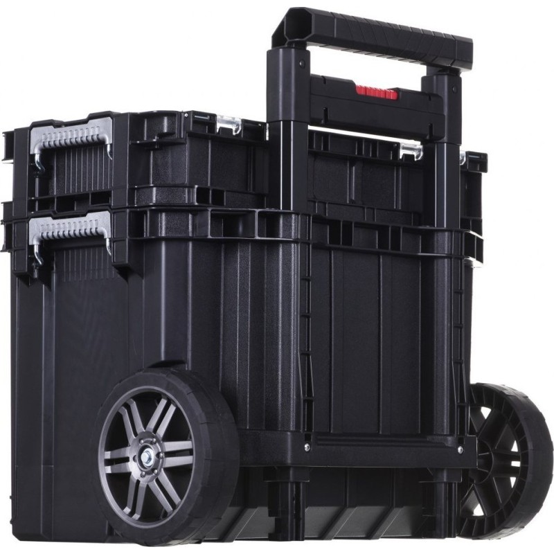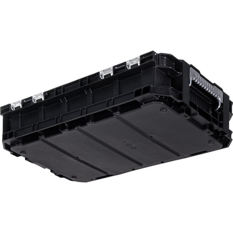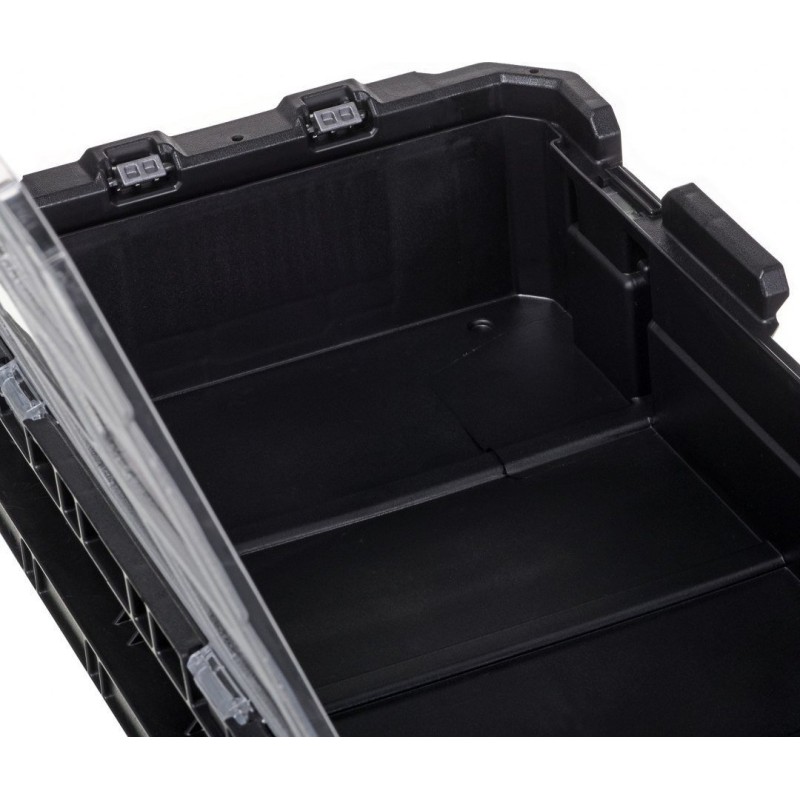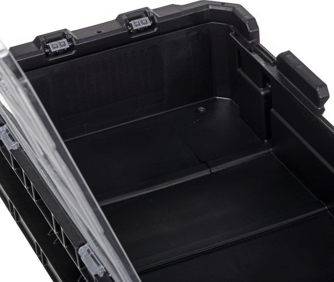Posiada wytrzymałe blokady do ustawiania piętrowego, skrzynkę narzędziową i pojemnik z przegródkami do małych części