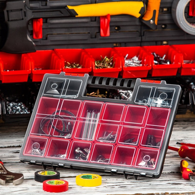 Dzięki niemu możesz posegregować niezbędne akcesoria warsztatowe i drobne narzędzia w jednym miejscu! I co ważne, w razie napraw nie musisz brać całej skrzynki! Możesz wyciągnąć tylko to, co potrzebujesz dzięki wyjmowanym szufladkom. Sprawdź jak wiele korzyści może przynieść organizer narzędziowy!