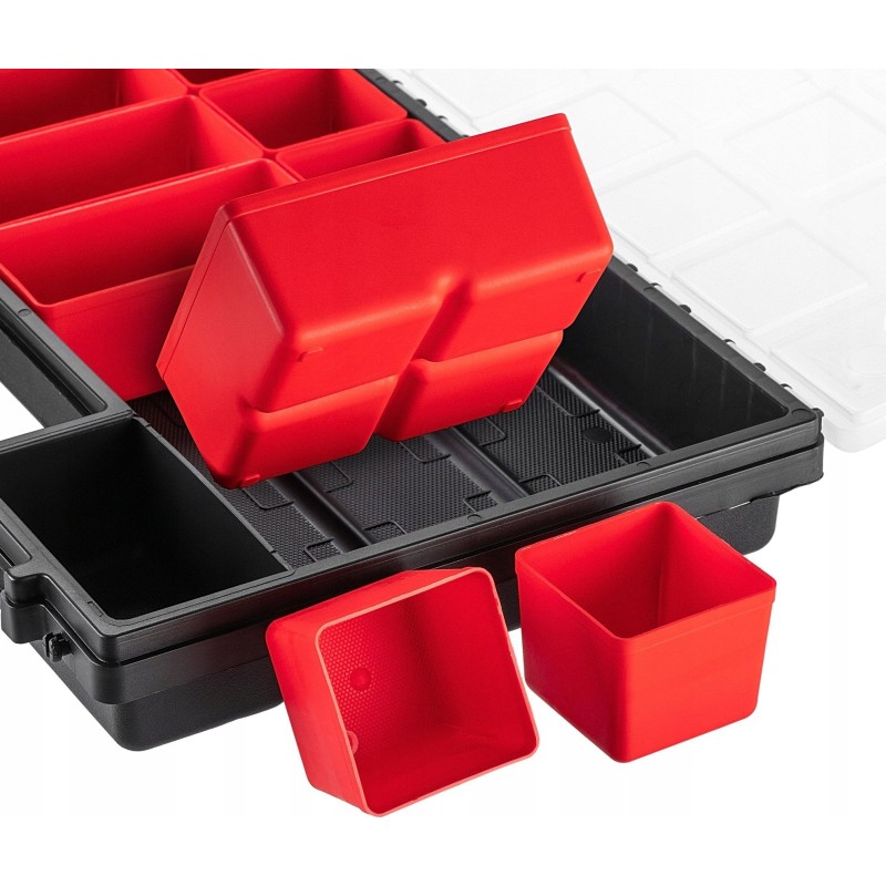 WYTRZYMAŁY – korpus i przezroczystą pokrywę wykonano z solidnego tworzywa sztucznego. Organizer na narzędzia posiada wytrzymałe zapięcia, które zabezpieczają pokrywę i skutecznie chronią przed nieoczekiwanym wysypaniem zawartości.