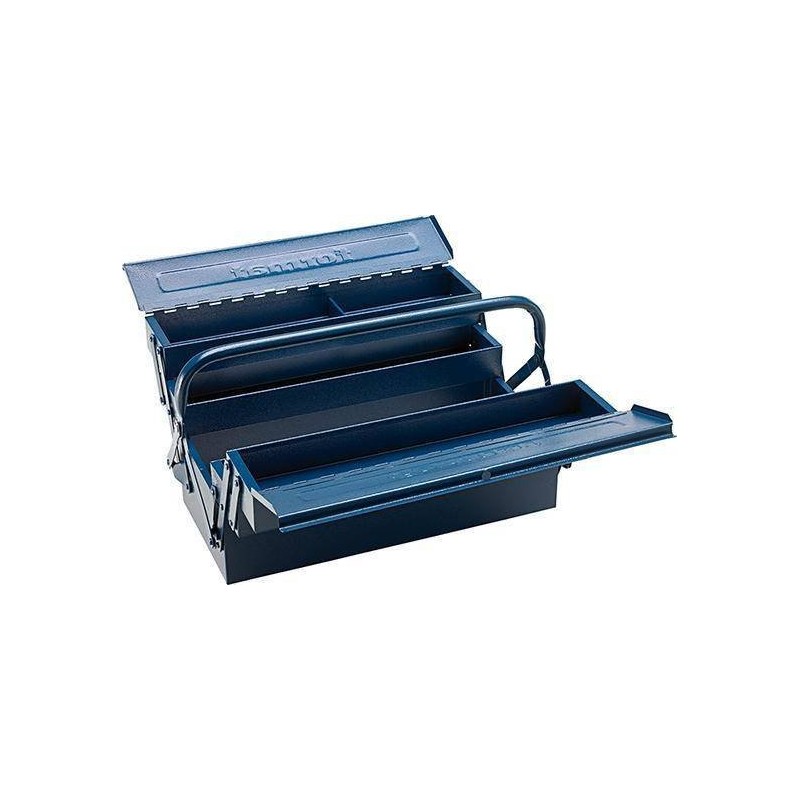 Opis: wykonana z blachy stalowej, wewnątrz i na zewnątrz lakierowana na kolor niebieski, posiada przechylany uchwyt do przenoszenia oraz automatyczne zamykanie skrzynki narzędziowej poprzez wysunięcie uchwytu. Możliwość rozłożenia dzięki solidnym, nitowanym zawiasom.