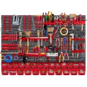 FUNKCJONALNE - kuwety warsztatowe pomieszczą naprawdę sporo elementów drobnicowych i niewielkich narzędzi. Półka i uchwyty warsztatowe pozwolą uporządkować w jednym miejscu śrubokręty, wiertła, bity, klucze oraz inne akcesoria, które chcesz mieć pod ręką.
