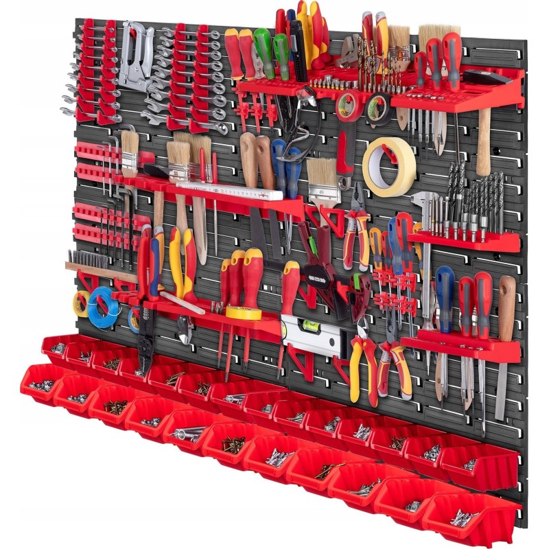 ŁATWY MONTAŻ - montaż tablicy narzędziowej jest stosunkowo prosty za sprawą równomiernie umiejscowionych otworów. Wystarczy, że przykręcisz tablicę do ściany za pomocą kołków montażowych i zawiesisz akcesoria, aby cieszyć się stabilnym organizerem.