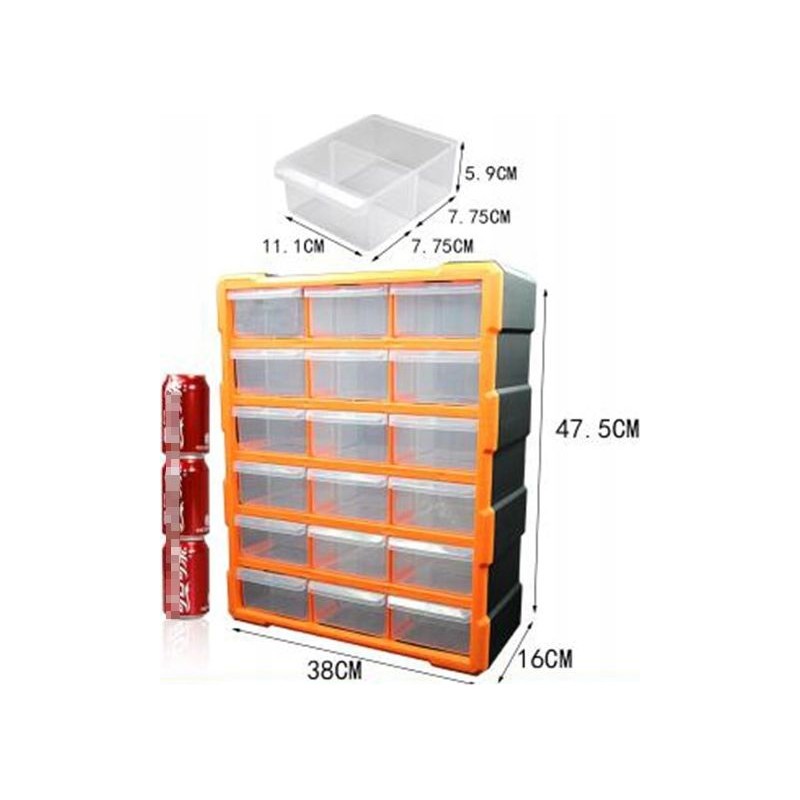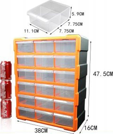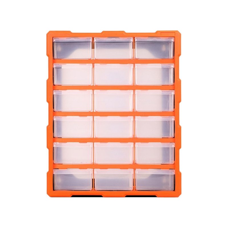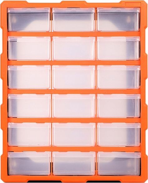 Organizer warsztatowy wyposażony w 18 szufladek. Posiada możliwość zawieszenia na ścianie lub postawienia. Zastosowanie czystego tworzywa (nie przemiału) zapewnia stabilność, trwałość konstrukcji korpusu oraz idealną przejrzystość szufladek. Nadaje się do zastosowań profesjonalnych jak i hobbystycznych. Skrzynka zawiera 18 transparentnych szufladek (11,x5,9x15,5cm) do przechowywania wkrętów, śrub, podkładek, końcówek kablowych i innych drobnych elementów. Każda szufladka posiada wyjmowaną przegrodę zwiększającą funkcjonalność, uchwyt na palce ułatwiający wysuwanie oraz blokadę zabezpieczającą przed przypadkowym wypadnięciem szufladki.