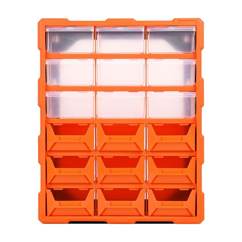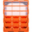 Organizer warsztatowy wyposażony w 18 szufladek. Posiada możliwość zawieszenia na ścianie lub postawienia. Zastosowanie czystego tworzywa (nie przemiału) zapewnia stabilność, trwałość konstrukcji korpusu oraz idealną przejrzystość szufladek. Nadaje się do zastosowań profesjonalnych jak i hobbystycznych. Skrzynka zawiera 9 transparentnych szufladek oraz 9 szufladek pomarańczowych (13,8,x10,6x6cm) do przechowywania wkrętów, śrub, podkładek, końcówek kablowych i innych drobnych elementów. Każda szufladka posiada wyjmowaną przegrodę zwiększającą funkcjonalność, uchwyt na palce ułatwiający wysuwanie oraz blokadę zabezpieczającą przed przypadkowym wypadnięciem szufladki.