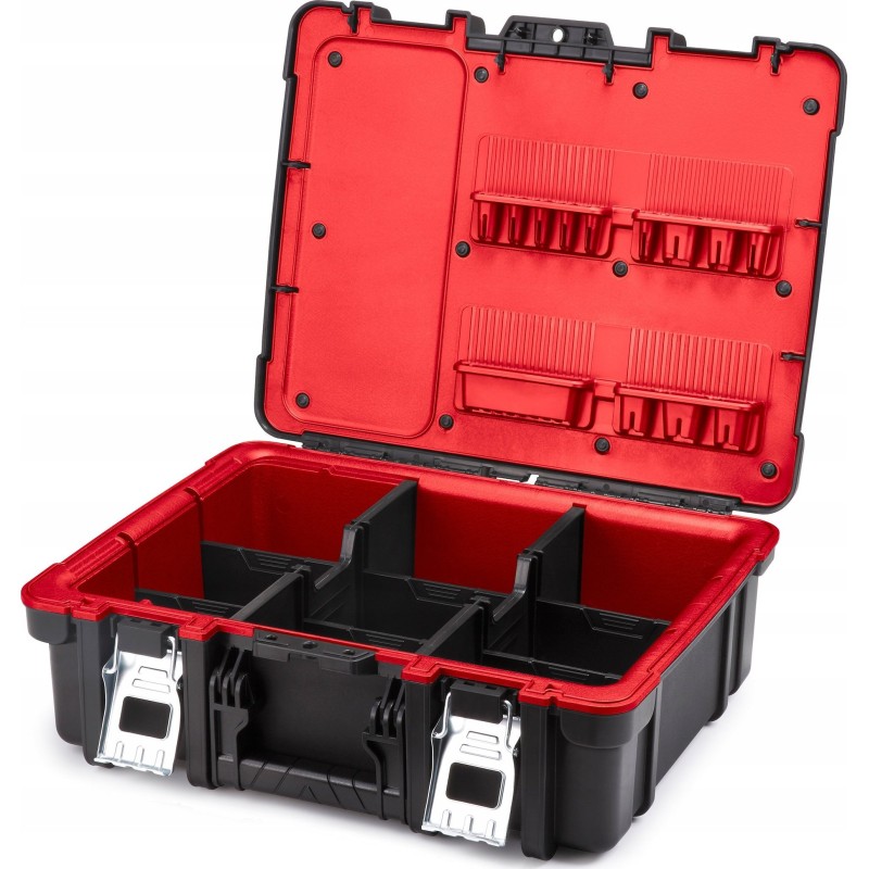 Wewnątrz skrzynki znajduje się wyjmowany organizer z 4 przegródkami, który umożliwia swobodny dostęp do narzędzi.