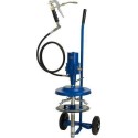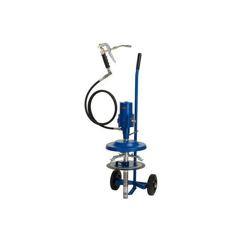 Pneumatyczny zestaw smarowniczyWykonanie: Mobilny, z wózkiem, z silnikiem pneumatycznym i pompą, ze zdejmowanym pistoletem smarowniczym, tłokiem nadążnym i wężem wysokociśnieniowym o długości 2 m. Pistolet smarowniczy z rurą dyszy i 4-szczękową końcówką smarowniczą oraz przegubem obrotowym z łożyskiem kulowym. Przełożenie ciśnienia wynosi 50:1. Przyłącze sprężonego powietrza z nyplem wtykowym do sprzęgła Rectus typu 26, NW 7,2 mm. Wydajność tłoczenia 1100 g/min, opróżnienie pojemnika 99 %. Zastosowanie: Do sprężarek 80 l/min i dodatkowych zastosowań przy zalecanym ciśnieniu powietrza 8 bar....