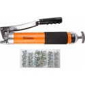 - W zestawie znajduje się stalowy wąż o długości 240 mm oraz elastyczny wężyk o długości 300 mm i gwincie M10, służące do wprowadzania zawartości do elementów mechanicznych.