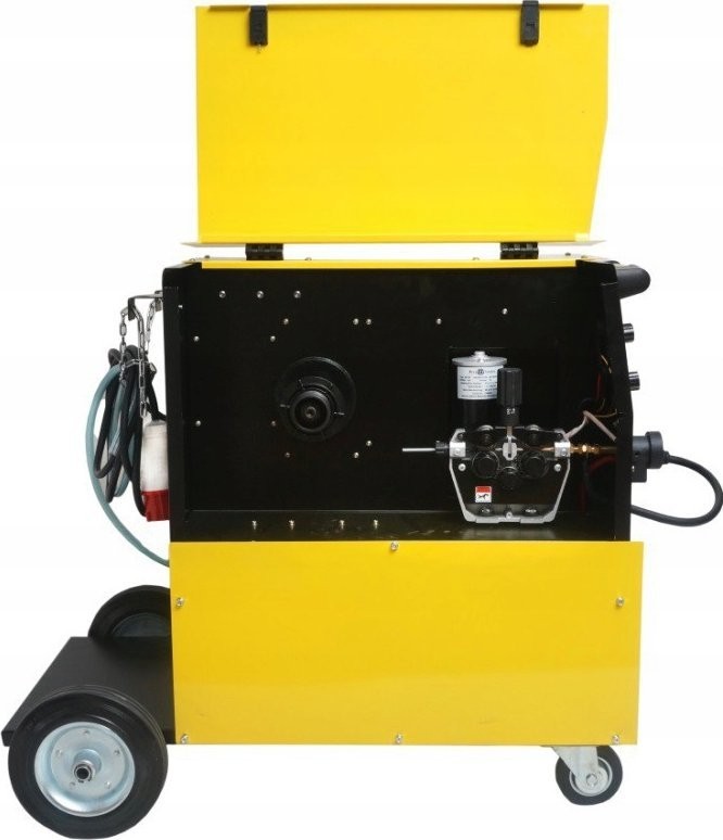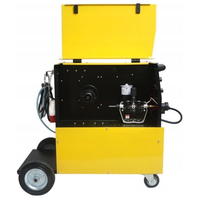 Źródło prądu zostało zbudowane w oparciu o najnowszą technologie wykorzystującą tranzystory IGBT, co przekłada się na zmniejszenie zakłóceń elektromagnetycznych, małe straty mocy, zwiększenie wydajności i niezawodności źródła prądu oraz wpłynęło znacząco na zmniejszenie zużycie energii. Urządzenie posiada płynną regulacje parametrów spawania, wyposażone jest w przeciążeniowy układ zabezpieczenia termicznego, zapobiegający nadmiernemu przegrzewaniu się. Spawarka wyposażona jest w funkcję 2T/4T, profesjonalny 4-rolkowy podajnik drutu z gniazdem "euro złącze" co pozwala na podłączenie różnych typów uchwytów spawalniczych oraz wyjście na podgrzewacz gazu.
