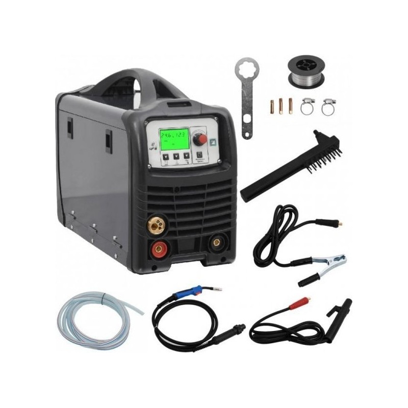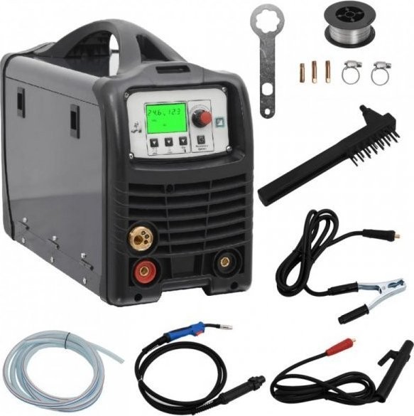 Ta spawarka to doskonały wybór dla majsterkowiczów i profesjonalnych spawaczy do wykonywania wszelkich prac konserwacyjnych i naprawczych. Wielofunkcyjna spawarka: urządzenie to umożliwia spawanie w różnych trybach: MMA, MIG i TIG Lift, co zaspokoi większość Twoich potrzeb roboczych.Sterowanie synergiczne: funkcja synergii pomaga automatycznie dostosować parametry spawania, takie jak prędkość podawania drutu i napięcie, w celu ułatwienia procesu i uzyskania optymalnej jakości spawania.Prosta obsługa: spawarka synergiczna posiada panel cyfrowy, który wyświetla parametry funkcji, zapewniając wygodną i bezproblemową obsługę.Szeroki zakres zastosowań: urządzenie to nadaje się do spawania stali oraz stali nierdzewnej. Jest przeznaczone do różnych celów, takich jak spawanie drzwi i okien, ogrodzeń, wiat garażowych i rur, a także do innych prac naprawczych.Kolor: szaro-czarnyMateriał: stal, plastikWymiary: 22,5 x 52 x 38 cm (szer. x gł. x wys.)Napięcie wejściowe: 230 VCzęstotliwość: 50 HzStopień ochrony obudowy: IP21SFunkcja 3-w-1: MIG, MMA, TIG LiftŹródło zasilania: siecioweDługość kabla zasilającego: 2 mFunkcja synergiiŚrednica drutu: 0,6 / 0,8 / 1 mmPrędkość podawania drutu: 2-12,5 / 2-12,5 / 2-8,1 m/minMożliwość spawania drutem pełnym (z gazem) i drutem topikowym (bez gazu)Do spawania stali i stali nierdzewnejWaga: 12,1 kgEfektywne natężenie prądu:MIG/MAG: maksymalnie 13,9 AMMA: maksymalnie 14,3 ATIG: maksymalnie 13,2 APrąd wyjściowy:Spawanie MIG/MAG: DC 40~200 ASpawanie MMA: DC 20~160 ASpawanie TIG: DC 20~200 ANapięcie wyjściowe:Spawanie MIG/MAG: DC 16~24 VSpawanie MMA: DC 20,8~26,4 VSpawanie TIG: DC 10,8~18,0 VEfektywna moc źródła zasilania:MIG/MAG/MMA: 81%TIG: 78%Zużycie mocy w trybie jałowym:MIG/MAG/TIG: 10 WMMA: 55 WCykl pracy:MIG/MAG:200 A 24 V - 15%100 A 19 V - 60%77 A 17,9 V - 100%MMA:160 A 26,4 V - 20%92 A 23,7 V - 60%72 A 22,9 V - 100%TIG:200 A 18 V - 20%200 A 18 V - 20%89 A 13,6 V - 100%Zawartość przesyłki:1 x spawarka1 x druciana szczotka4 x dysza (0,6/0,8/0,9/1 mm)1 x drut topikowy (0,9 mm 0,45 kg)1 x palnik MIG z przewodem (3 m z łącznikiem)1 x klamra uziemienia z przewodem (2 m)1 x uchwyt elektrody z przewodem (2 m)1 x klucz płaski...