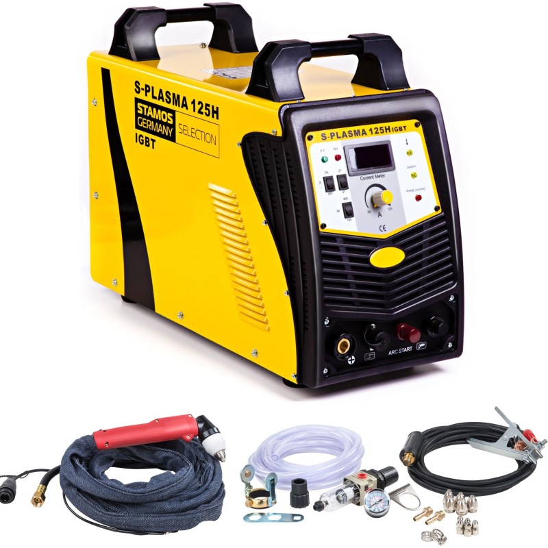 Cięcie plazmą - dzięki natężeniu prądu do 125 A, urządzenie bezproblemowo przetnie takie metale jak, żelazo, stal nierdzewna, żeliwo, miedź, czy aluminium. Ciśnienie powietrza jest regulowane bezstopniowo, co pozwala na precyzyjną kontrolę strumienia plazmy. Nieprzepalanie materiału, niewielka ilość zniekształceń oraz gładka szczelina cięcia to część zalet, wynikających z użycia wielofunkcyjnego urządzenia Stamos Germany.