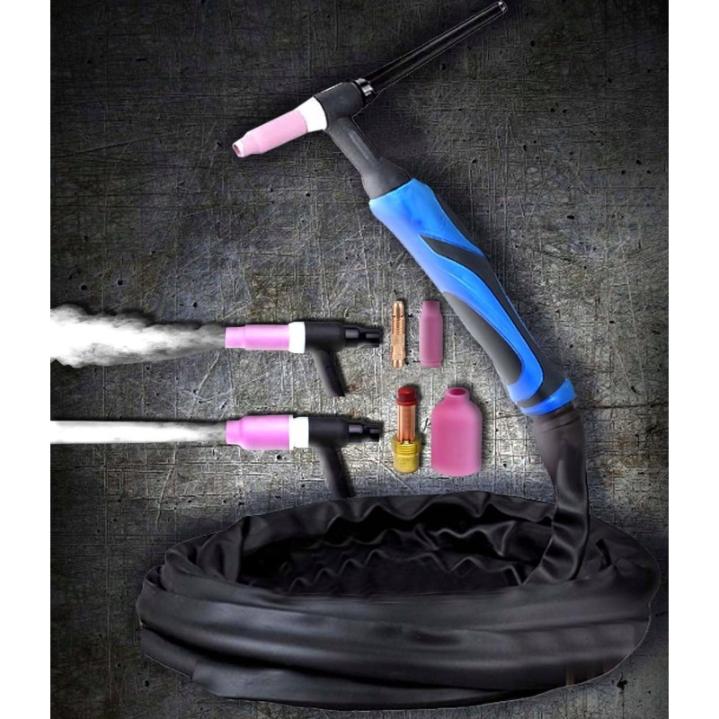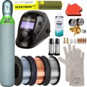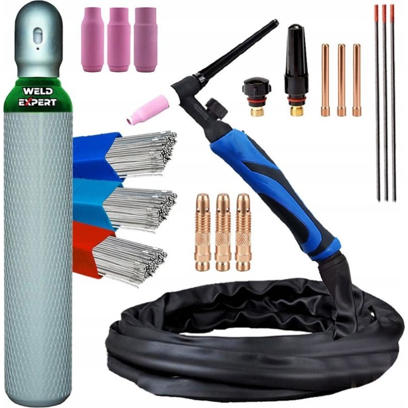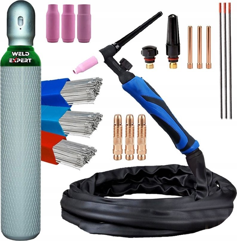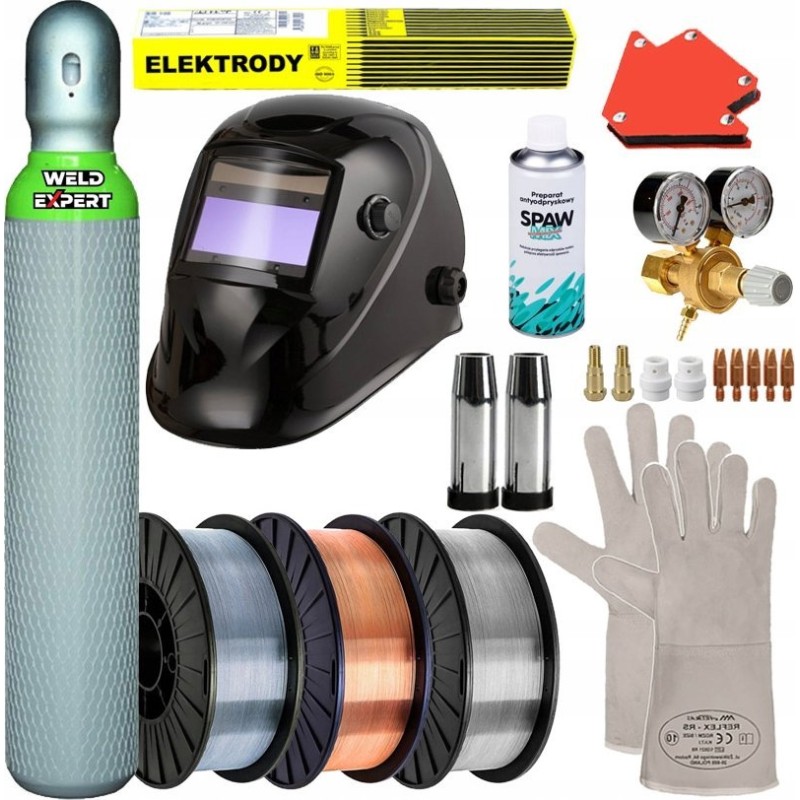 W zestawie z urządzeniem znajduje się wszystko, co niezbędne do rozpoczęcia pracy. Obejmuje on uchwyt TIG LIFT TIG-17V, automatyczną przyłbicę IDEAL APS-510G, butle gazowe oraz różnorodne akcesoria spawalnicze, co czyni go kompletnym rozwiązaniem dla każdego spawacza.