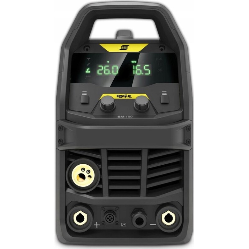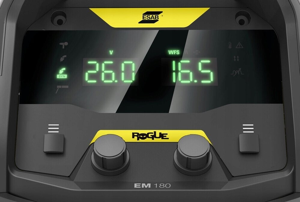 Wyposażona w synergiczne programy spawania, spawarka ESAB Rogue EM 180 umożliwia łatwe dostosowanie parametrów spawania za pomocą jednego pokrętła. Duży 14-segmentowy wyświetlacz dostarcza natychmiastowych informacji o napięciu i prędkości podawania drutu, co zwiększa komfort pracy oraz precyzję spawania.