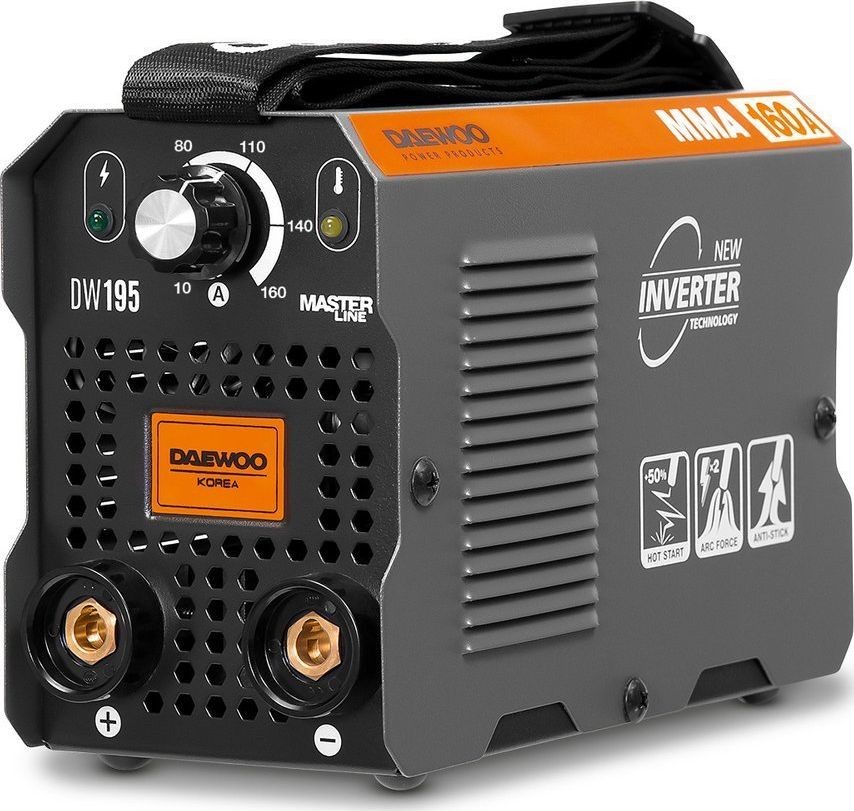 Spawarka inwertorowa DAEWOO DW 195 z układem wymuszonego chłodzenia. Regulacja prądu spawania w zakresie od 20 A do 145 A umożliwia wybór natężenia w zależności od rodzaju wykonywanych prac. Maksymalny czas ciągłej pracy wynosi 6 minut. Spawarka inwertorowa marki Daewoo przeznaczona jest do spawania łukowego elektrodą otuloną (MMA). Wykonana w najnowszej technologii tranzystorów wysoko przepustowych (z elektroniczną przetwornicą przepustową). Spawarki te charakteryzują się znacznie mniejszymi gabarytami i masą w porównaniu ze spawarkami tradycyjnymi, co czyni je szczególnie przydatnymi do wszelkich prac instalacyjnych