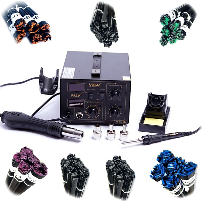 Stacja lutownicza Yihua 852D+ została wyposażona w mocny element grzejny gwarantujący szybkie nagrzewanie oraz trwałość grzałki. Posiada płynną regulacje nawiewu oraz temperatury. Stacja została zaprojektowana do prac lutowniczych z takimi komponentami jak układy SOIC, QFP, PLCC, BGA, SMD itd. Jak również nagrzewaniem, wygrzewaniem koszulek termokurczliwych, rozmrażaniem, rozpuszczaniem klejów, opalaniem farb, podgrzewaniem itp.