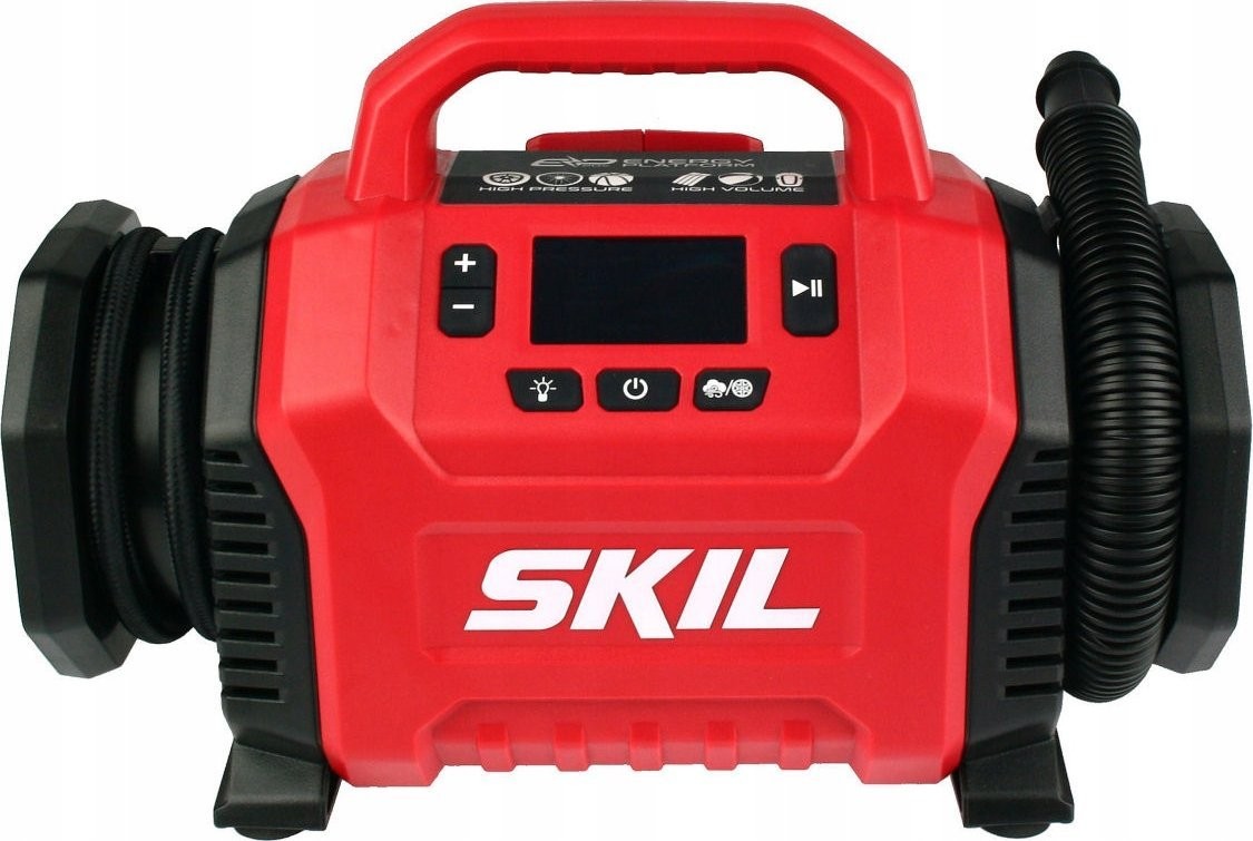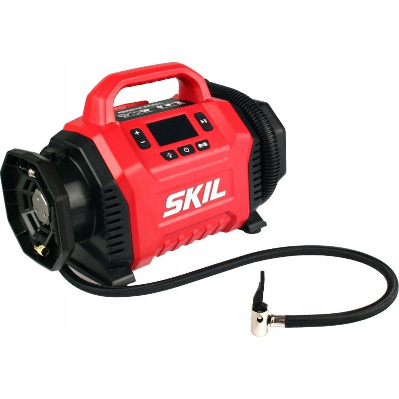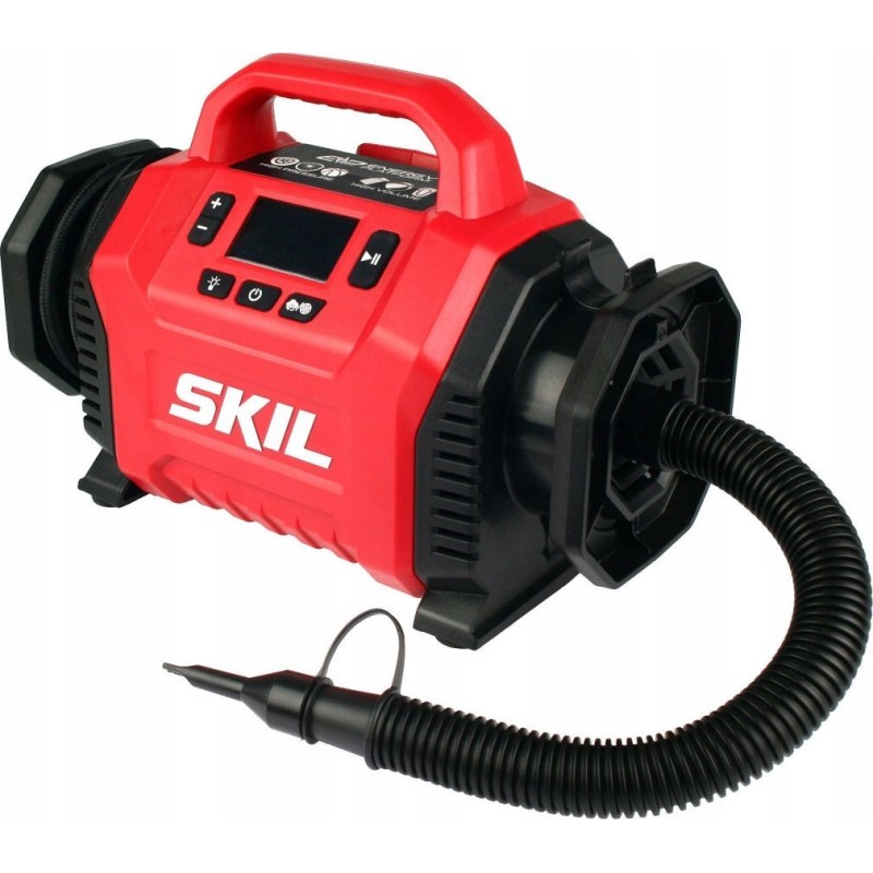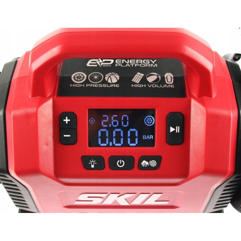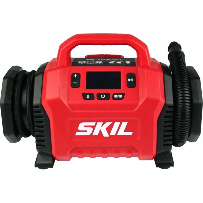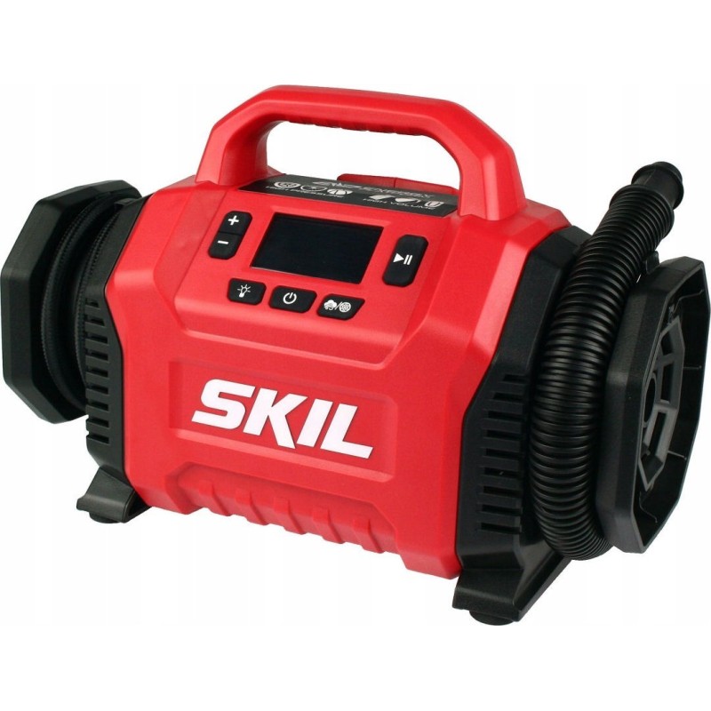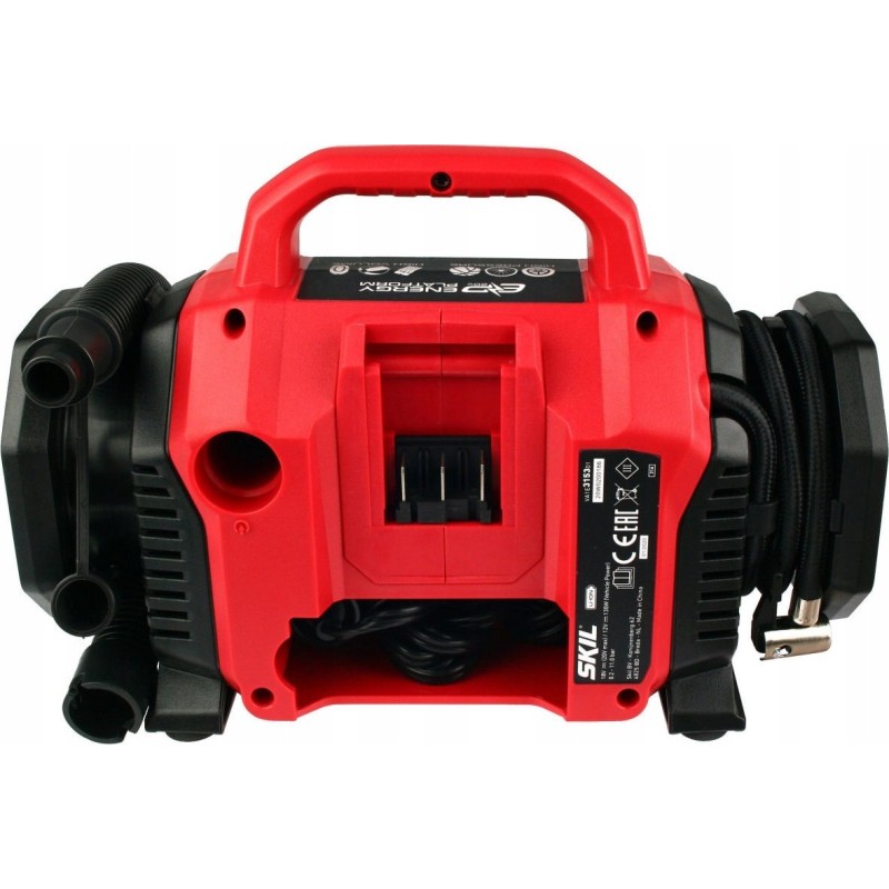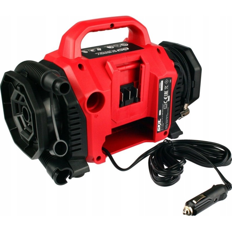 Dwa źródła zasilania do wyboru - zasilanie akumulatorowe z wykorzystaniem akumulatora litowo-jonowego 20V Max (18V) firmy SKIL lub zasilanie z gniazda zapalniczki samochodowej DC 12V.