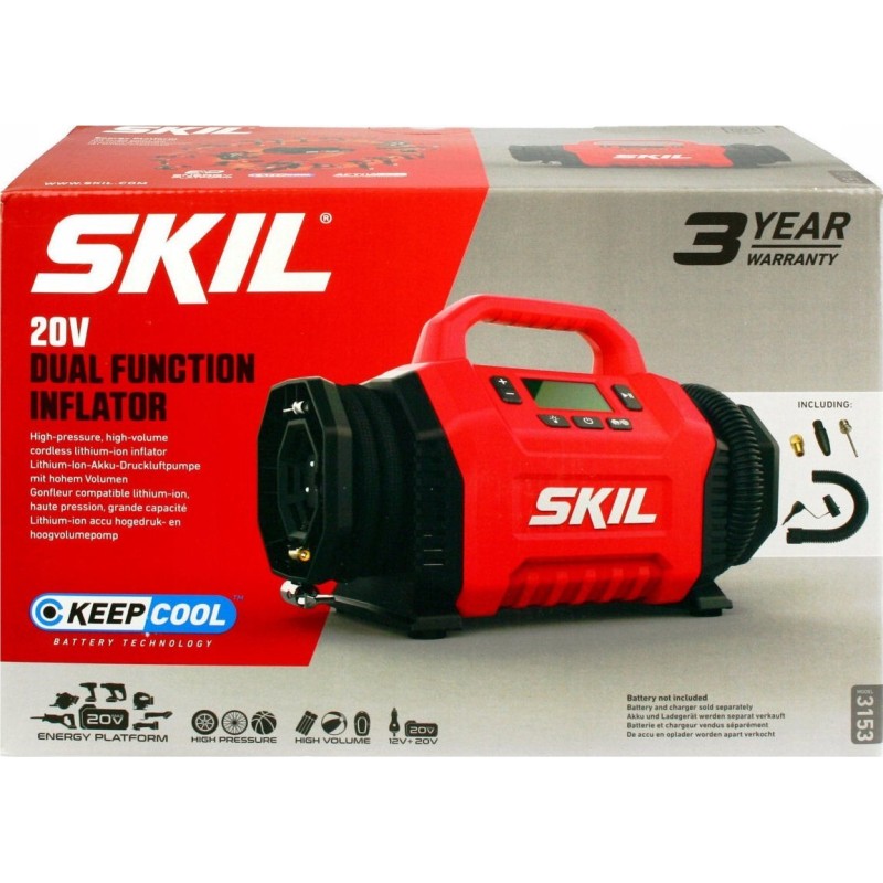 Jako źródeł zasilania można użyć akumulatora firmy SKIL 20V Max (18V) lub zasilania z gniazda zapalniczki samochodowej DC 12 V.