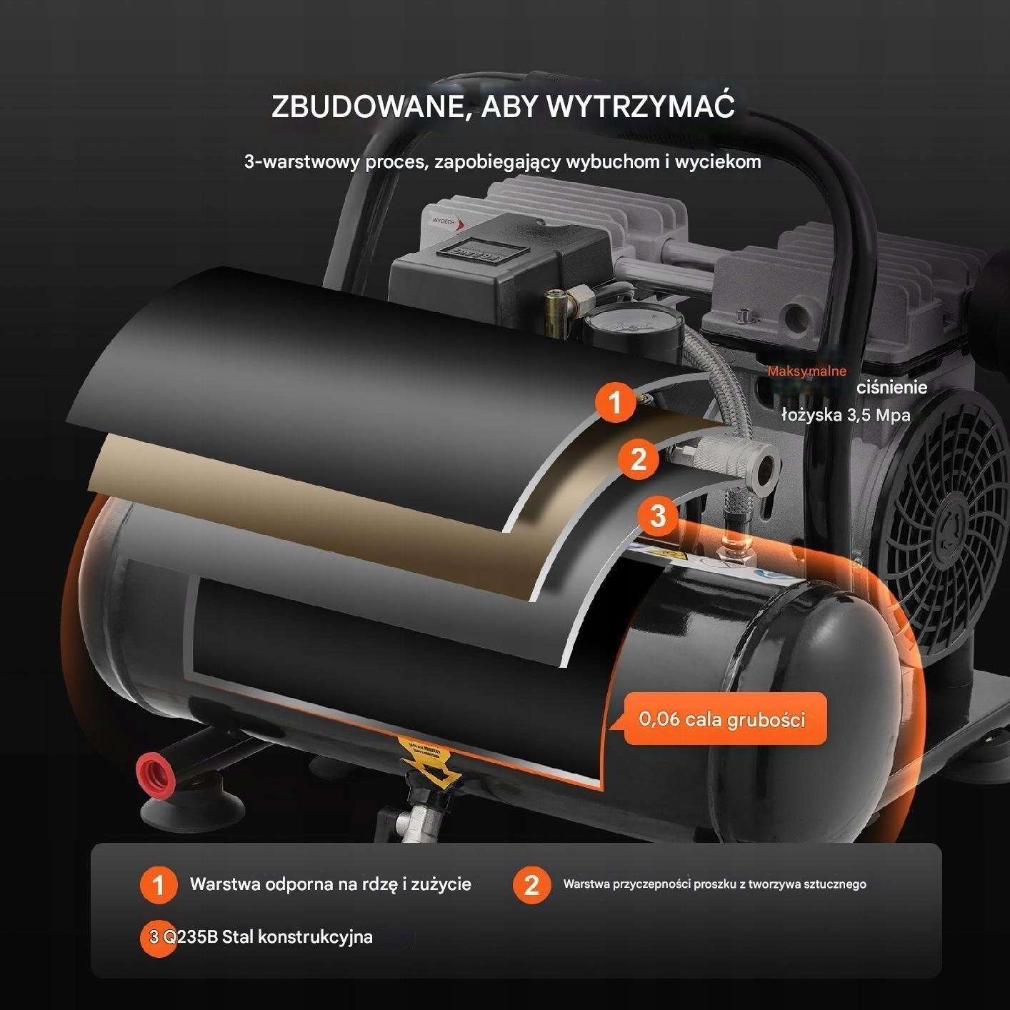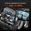 Zbiornik kompresora wyposażony jest w duży wentylator chłodzący oraz automatyczną ochronę przed przegrzaniem, co zapobiega uszkodzeniom. Dodatkowo, gdy prąd lub ciśnienie przechowywania jest zbyt wysokie, kompresor automatycznie wyłącza się lub zwalnia ciśnienie.