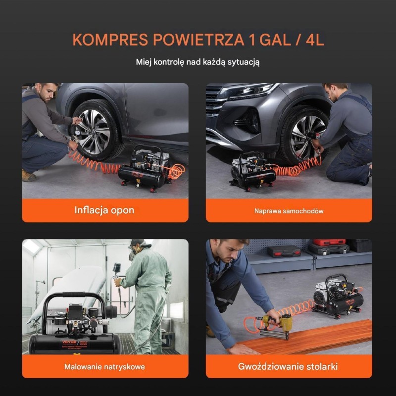 Ten samopoziomujący się kompresor wyposażony jest w silnik bezolejowy o mocy 0,8 KM (650 W), dostarczający wystarczającą moc do obsługi różnorodnych narzędzi pneumatycznych. Zapewnia odpowiednie wsparcie w aplikacjach takich jak gwoździowanie, malowanie i inne prace.