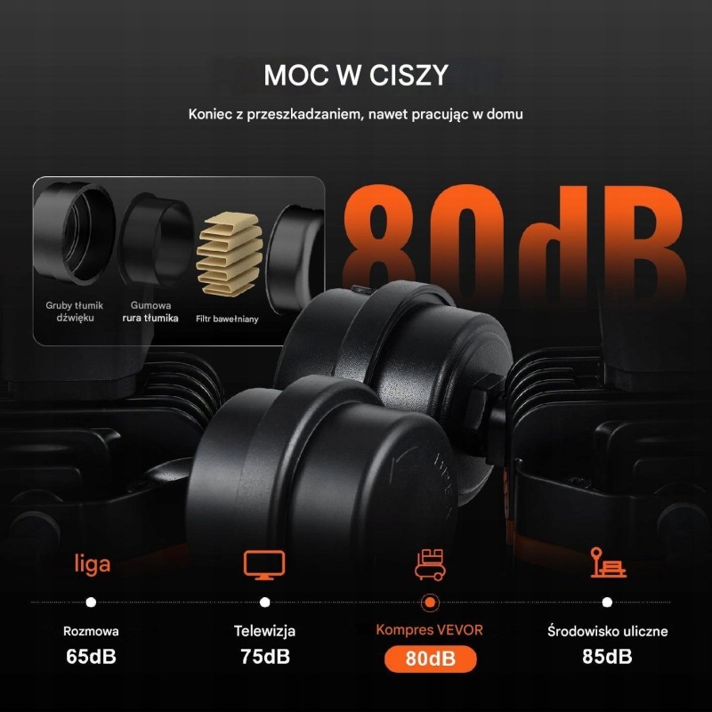 Nasza wyjątkowo cicha sprężarka powietrza emituje jedynie 80. Wyposażona w wysokiej jakości tłumik, który zawiera pogrubioną pokrywę, gumową rurę tłumiącą oraz bawełniany filtr. Skutecznie zmniejsza hałas i zapobiega wnikaniu drobnych cząstek kurzu do wnętrza.