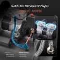 Zbiornik kompresora wyposażony jest w duży wentylator chłodzący oraz automatyczną ochronę przed przegrzaniem, co zapobiega uszkodzeniom. Dodatkowo, gdy prąd lub ciśnienie przechowywania jest zbyt wysokie, kompresor automatycznie wyłącza się lub zwalnia ciśnienie.