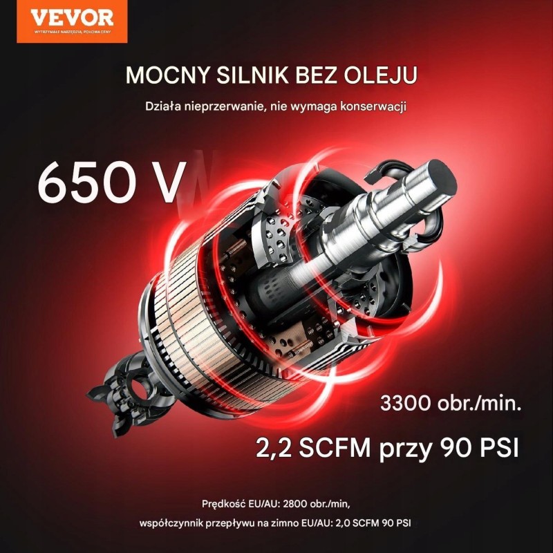 Nasz bezolejowy silnik o mocy 650 W napędza kompresor z prędkością 2800 obr./min, dostarczając 57 l/min przy 6,2 bara (90 PSI). Idealny do obsługi różnorodnych narzędzi pneumatycznych, takich jak gwoździarki, klucze udarowe, pistolety natryskowe czy śrubokręty pneumatyczne. Doskonale sprawdza się przy pompowaniu opon, naprawach samochodowych, malowaniu natryskowym oraz przy pracach stolarskich.