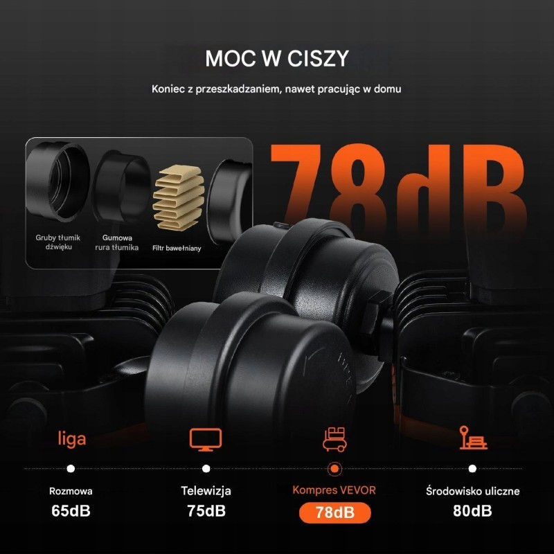 Nasz nowoczesny sprężarka powietrza emituje jedynie 78 dB. Wyposażona w wysokiej jakości tłumik, który zawiera dodatkową pokrywę, gumową rurę tłumiącą oraz bawełniany filtr. Skutecznie redukuje hałas i zapobiega wnikaniu drobnych cząstek kurzu do wnętrza.