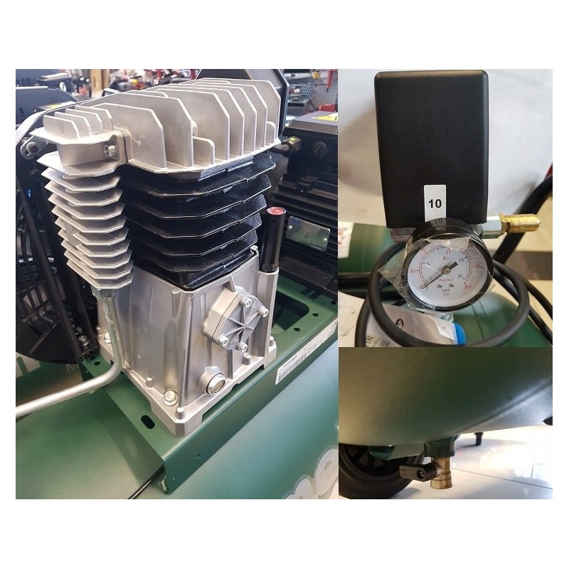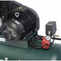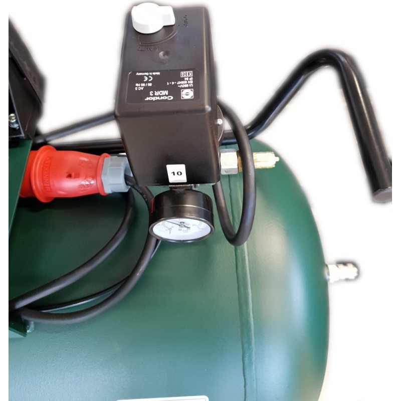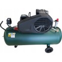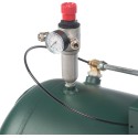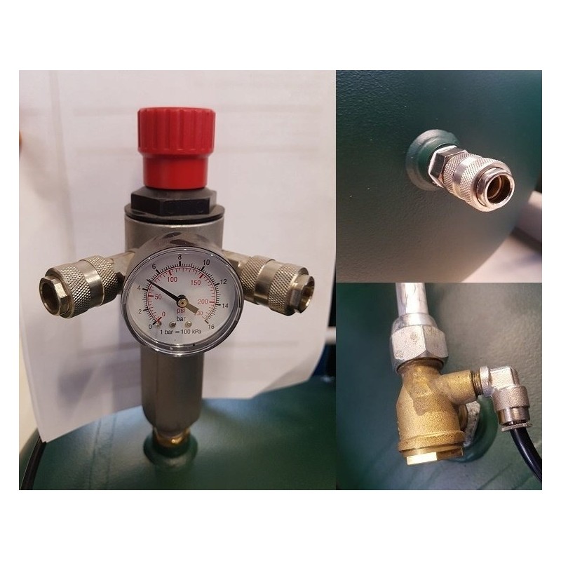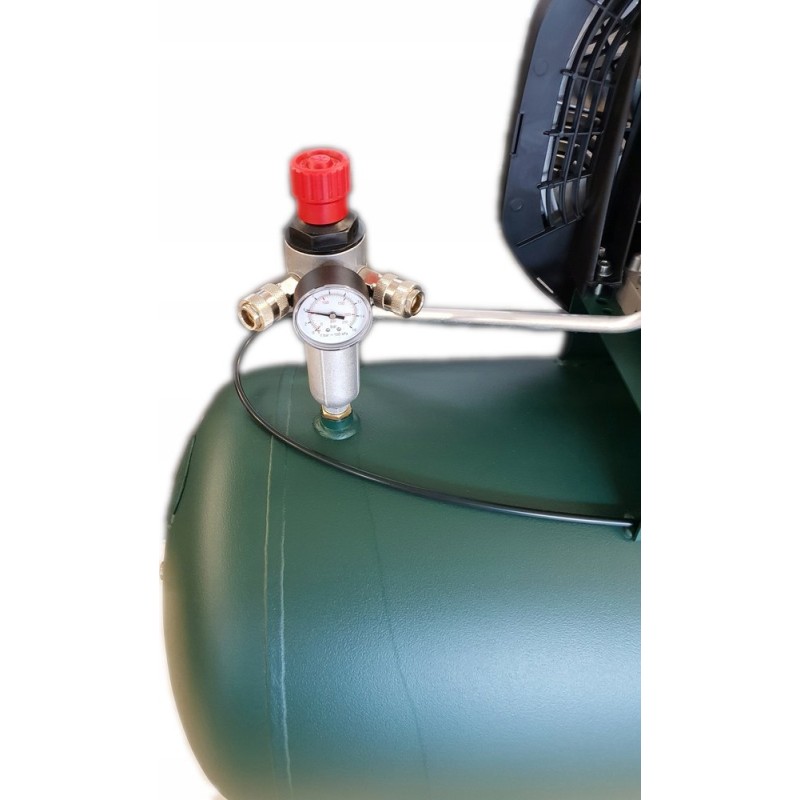 Kompresor wyposażony jest w pionowy reduktor ciśnienia z manometrem z dwoma gniazdami szybkozłączy do ustawiania ciśnienia, dodatkowe wyjście ze zbiornika ze szybkozłączem oraz zawór zwrotny.