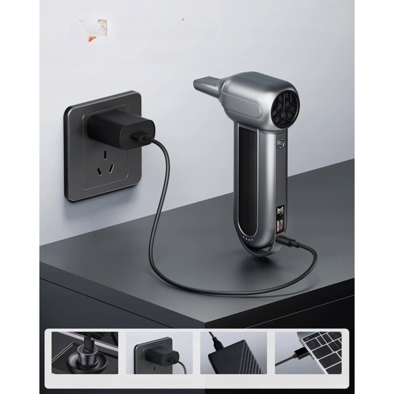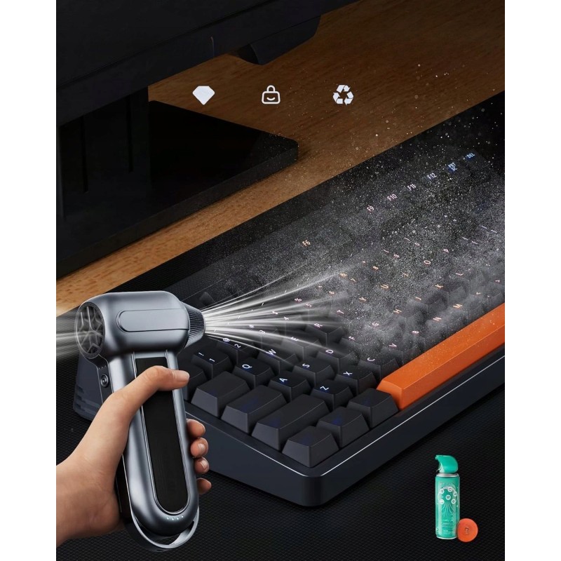 Sprężarka WOLFBOX MF100 jest wyposażona w potężny silnik, który osiąga prędkość obrotową 150000 RPM. Taka moc generuje przepływ powietrza przekraczający 45 m/s, co znacznie ułatwia usuwanie zanieczyszczeń oraz szybkie pompowanie różnych przedmiotów.
