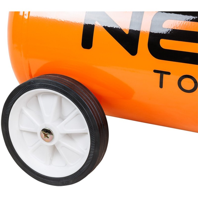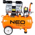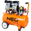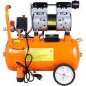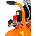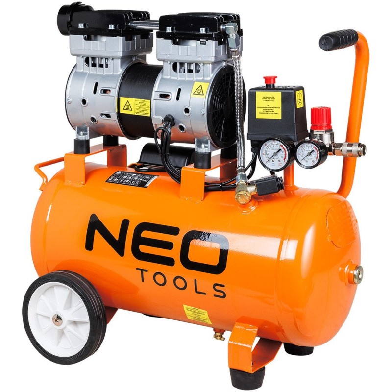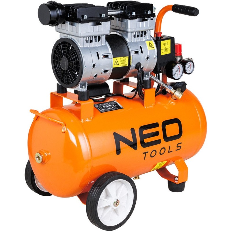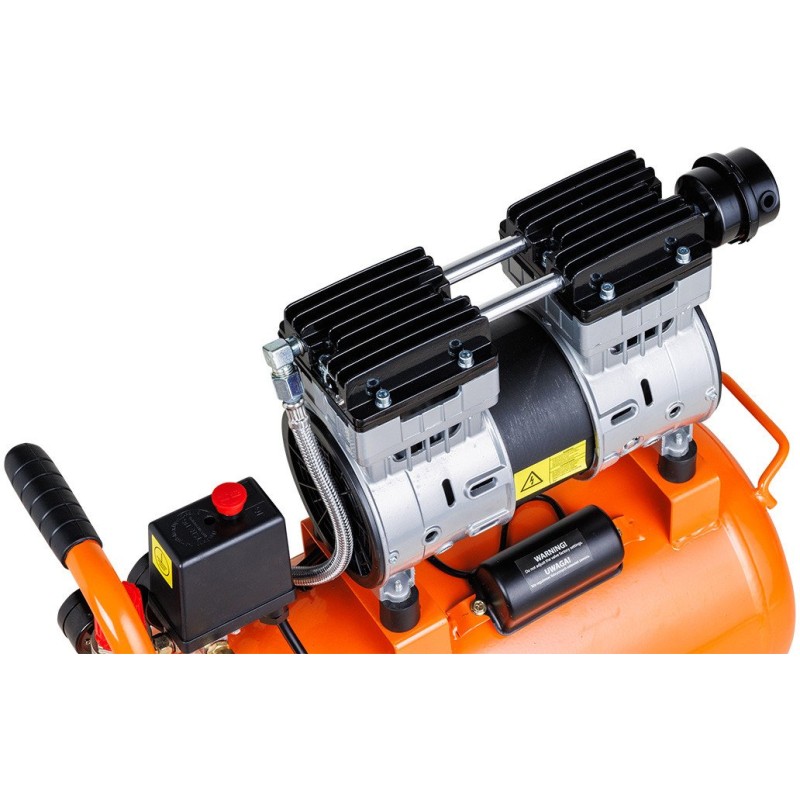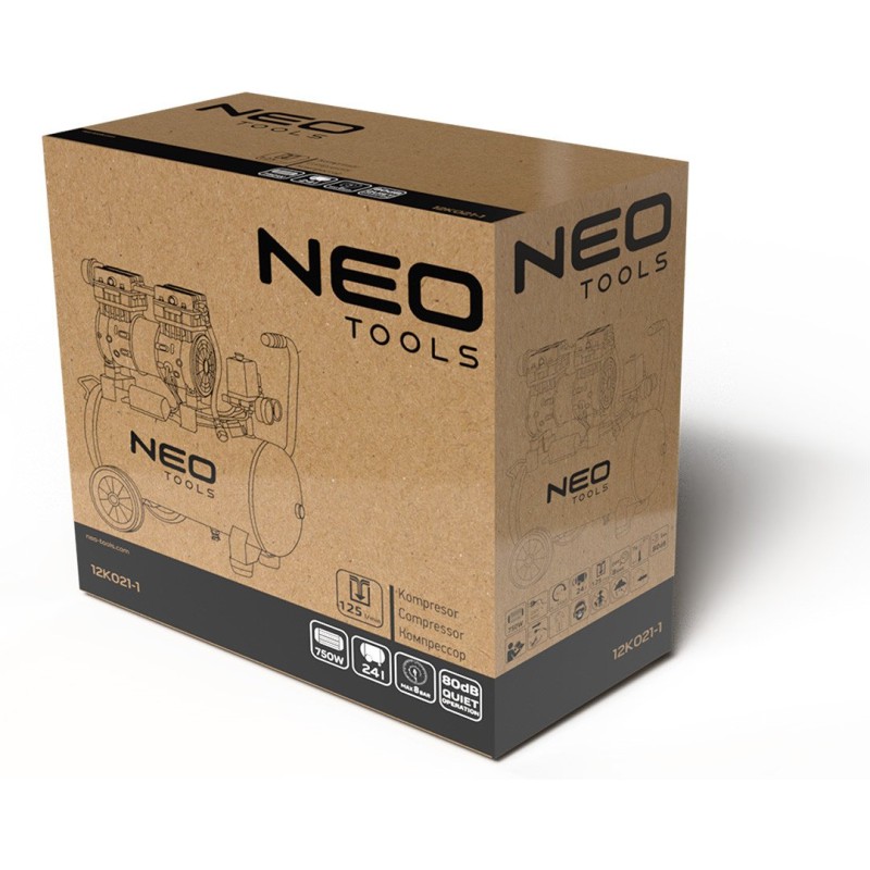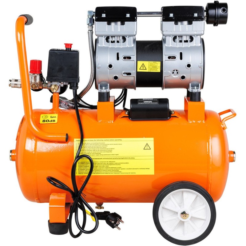 Kompresor bezolejowy, pojemność zbiornika 24 l, zasilanie 230V / 50Hz, moc silnika 750 W, 1450 rpm, wydajność 125 l/min, maksymalne ciśnienie 8 bar (115 PSI), natężenie dźwięku: 80 dB, IPX0, S1, I klasa ochronności, waga 21 kg, dwa koła o średnicy 14,6 cm, dwa manometry, dwa przyłącza , regulator ciśnienia, wymiary zbiornika: 240*410, czas napełnienia zbiornika: 135 s.