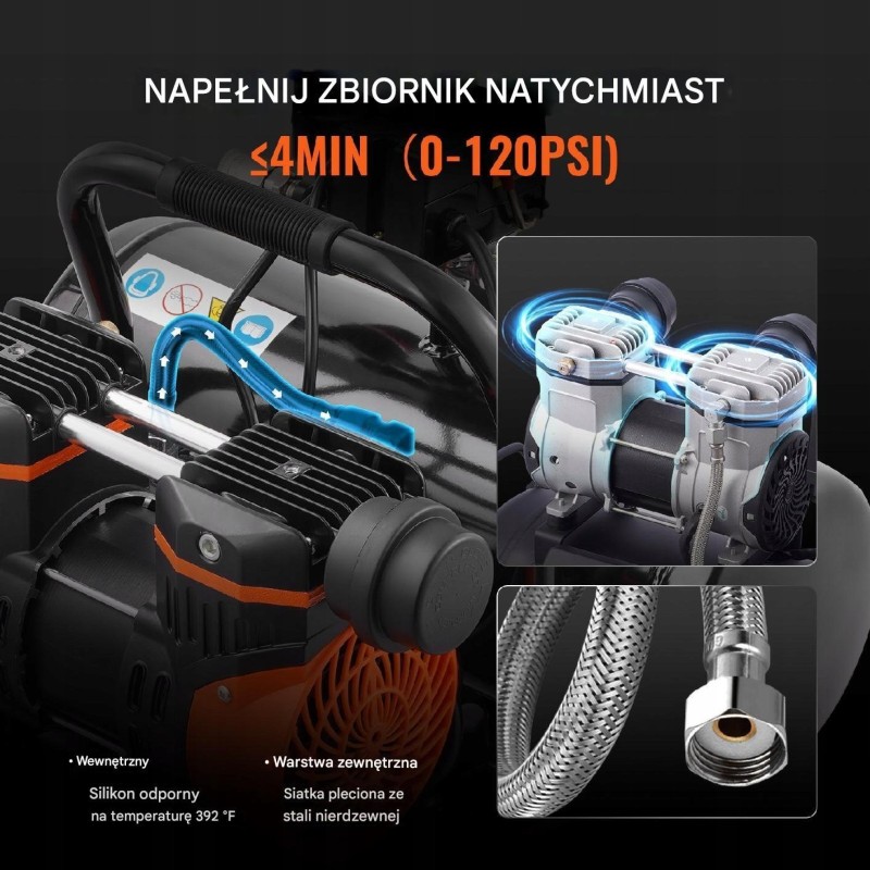 Bezolejowa sprężarka powietrza wykorzystuje specjalny system na rurkę i cylindryczny system poboru powietrza, co skutecznie oszczędza czas i wysiłek. Rura ssąca wykonana jest z wysokotemperaturowego silikonu oraz stalowej siatki w oplocie, co zapewnia podwójną ochronę przed uszkodzeniami i korozją.
