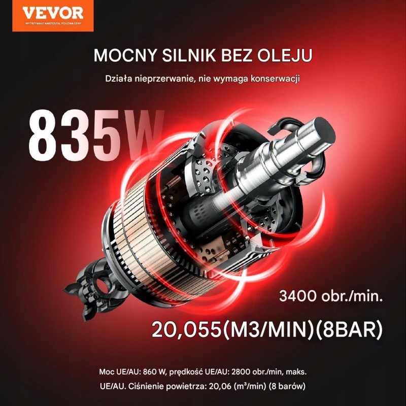 Nasza sprężarka powietrza bezolejowa z silnikiem o mocy 860 W napędza kompresor z prędkością 2800 obr./min, dostarczając 70 l/min przy 8 barach (90 PSI). Idealna do obsługi różnych narzędzi pneumatycznych, takich jak gwoździarki, klucze udarowe, pistolety natryskowe czy śrubokręty pneumatyczne. Doskonale sprawdza się przy pompowaniu opon, naprawach samochodowych, malowaniu natryskowym oraz pracach stolarskich.