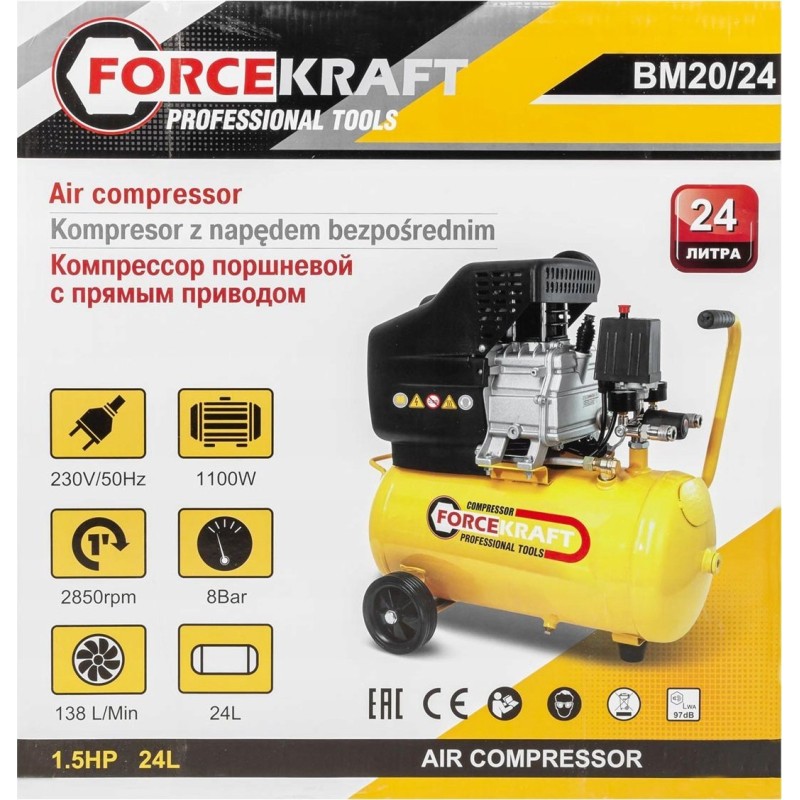 Sprężarka Forcekraft Sprężarka tłokowa z bezpośrednim napędem (1.5kW, zbiornik 24l, 8bar, 180l/m, 230V)