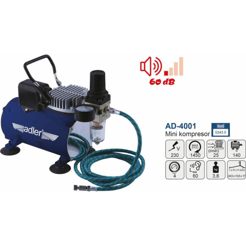 AD-4001 to tłokowy mini kompresor bezolejowy przeznaczony do zasilania aerografów w sprężone powietrze.